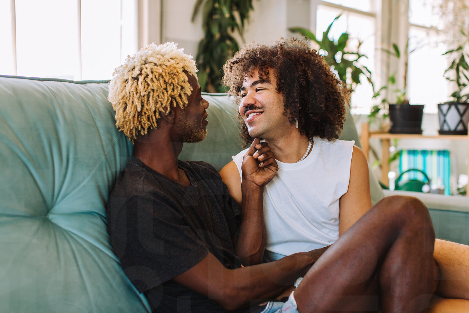 Young gay couple being romantic indoors. Two affectionate male lovers embracing and smiling at each other while sitting together in their living room. Young gay couple relaxing at home.