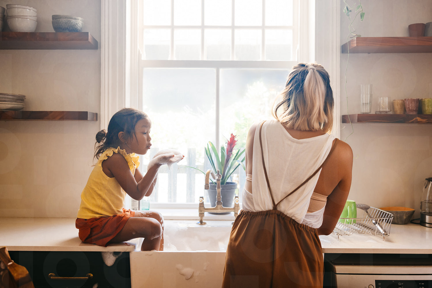 Young girl blowing soap bubbles at her mom in the kitchen. Sweet little girl playing with her mom while she washes the dishes in the sink. Mother and daughter spending some quality time together.
