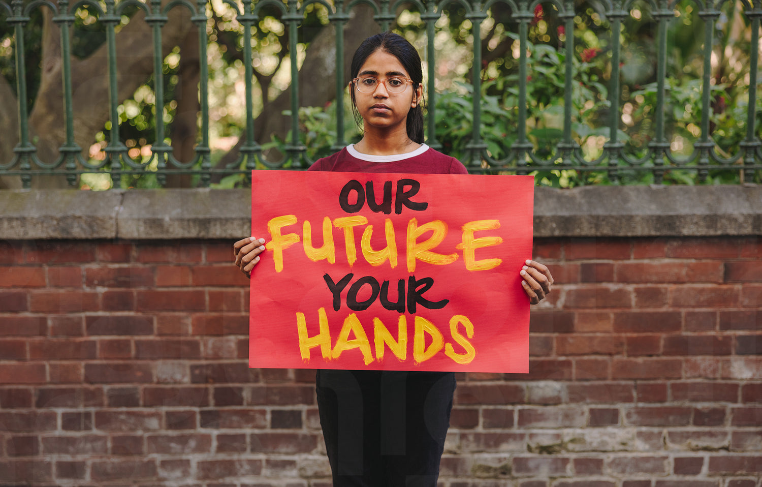 Young teenage girl looking at the camera while holding a climate change poster. Young environmental activist protesting against global warming and climate change.
