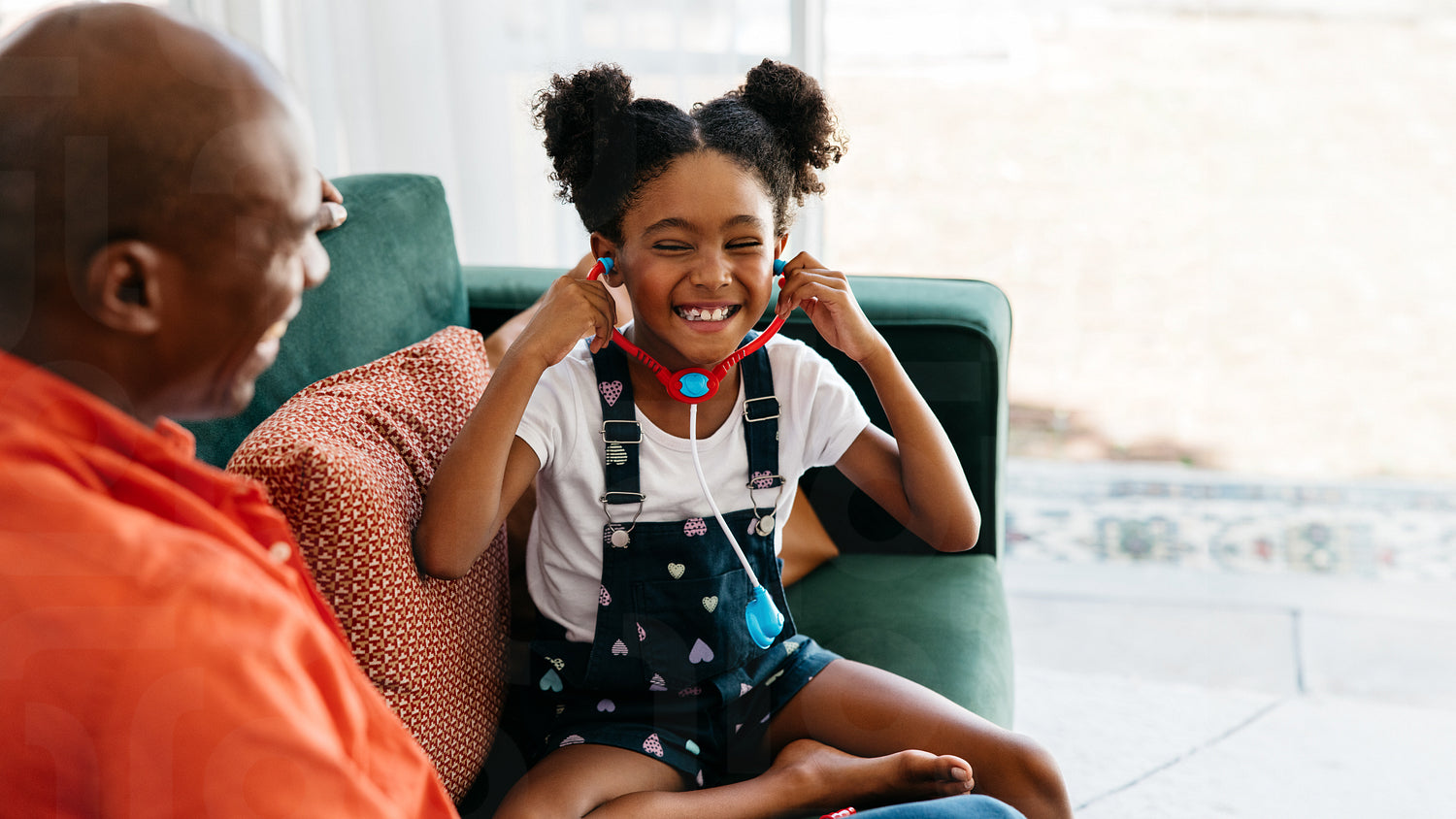 A joyful young girl uses a toy stethoscope on her smiling father as they spend quality time together in their cozy living room.