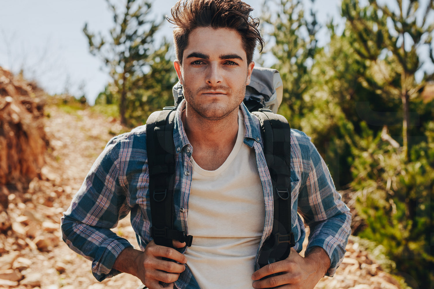 Handsome young guy with backpack walking down the mountain trail. Male hiking in nature on a summer day.