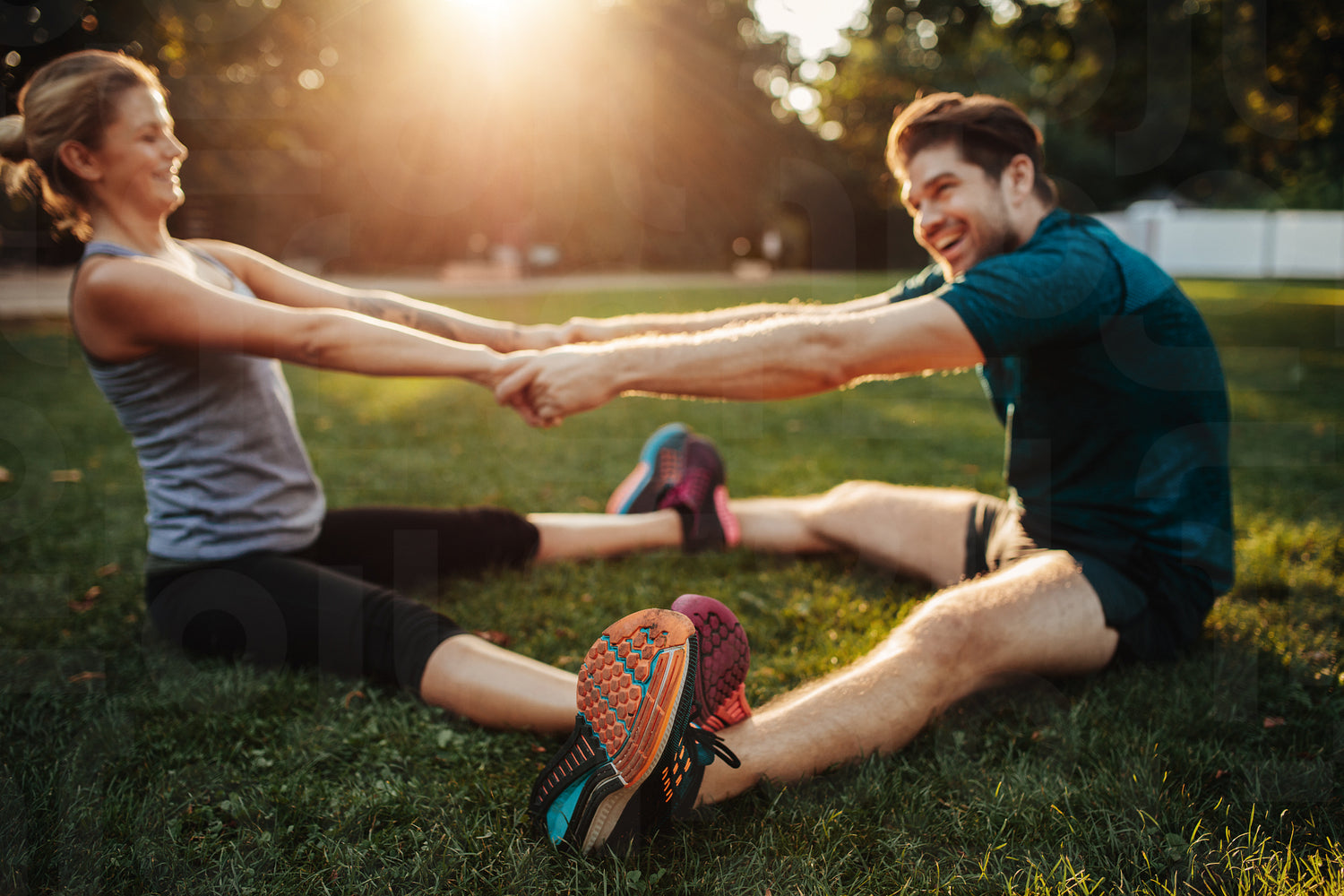 Young health couple doing stretching exercise and warm up in park. Man and woman sitting together holding hands and exercising.