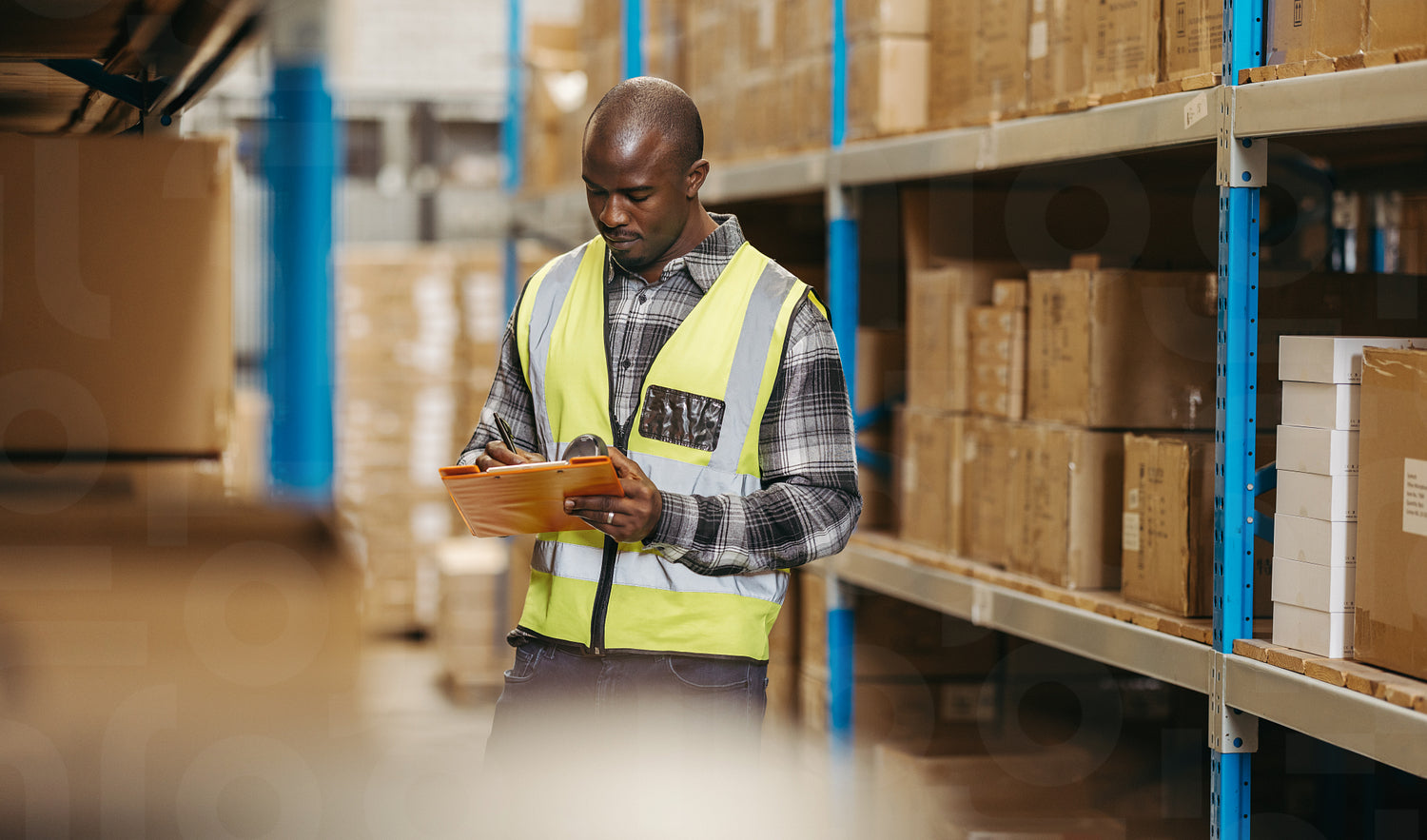 Male logistics manager recording inventory on a clipboard. Warehouse worker writing down SKU's while doing inventory control in a distribution centre.
