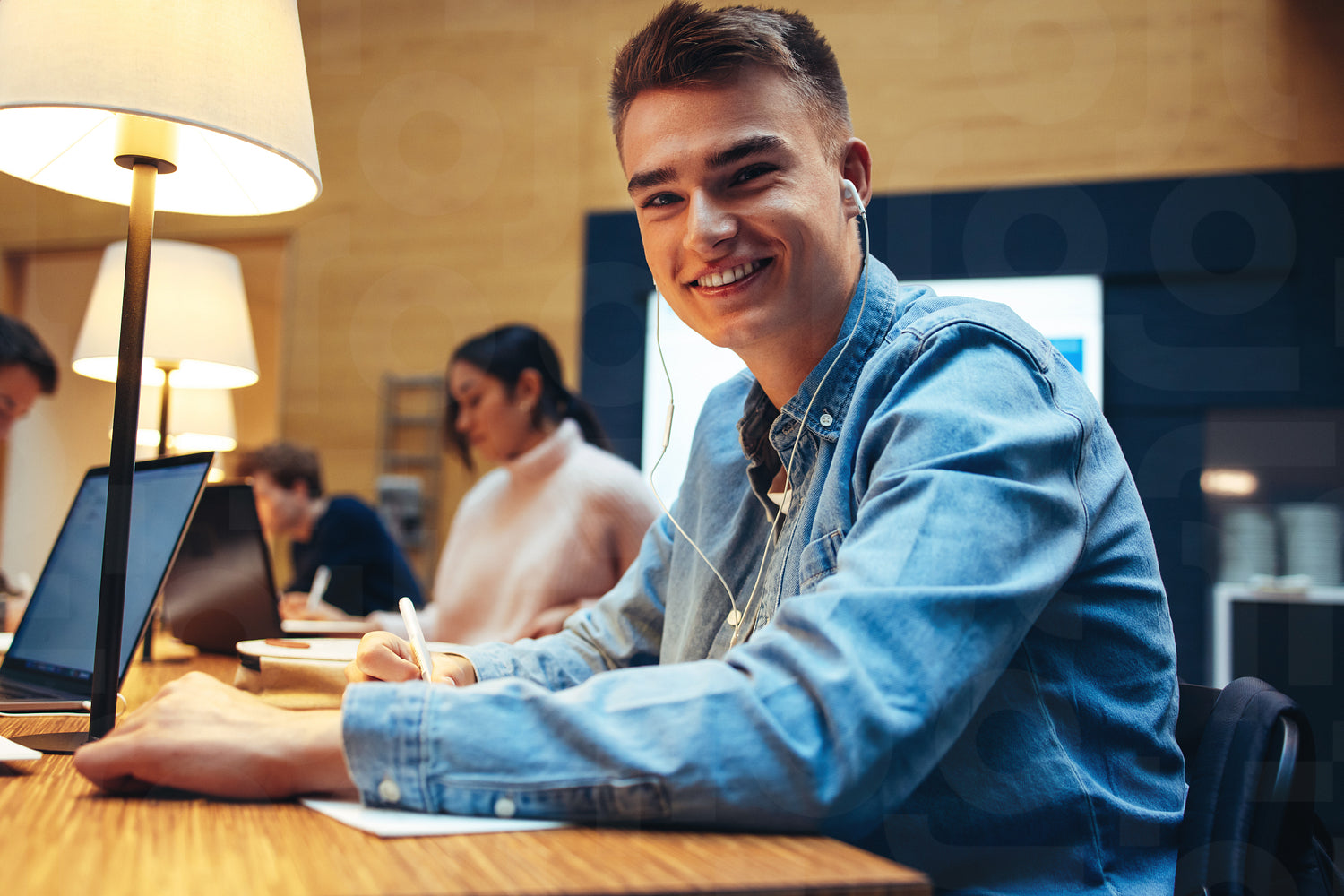 College student studying in library and smiling at camera. Young male student looking at camera while making notes in his book.