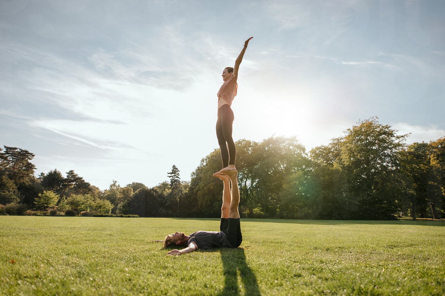 Outdoor shot of young man and woman doing yoga in pair. Couple doing acrobatic yoga exercise at park.
