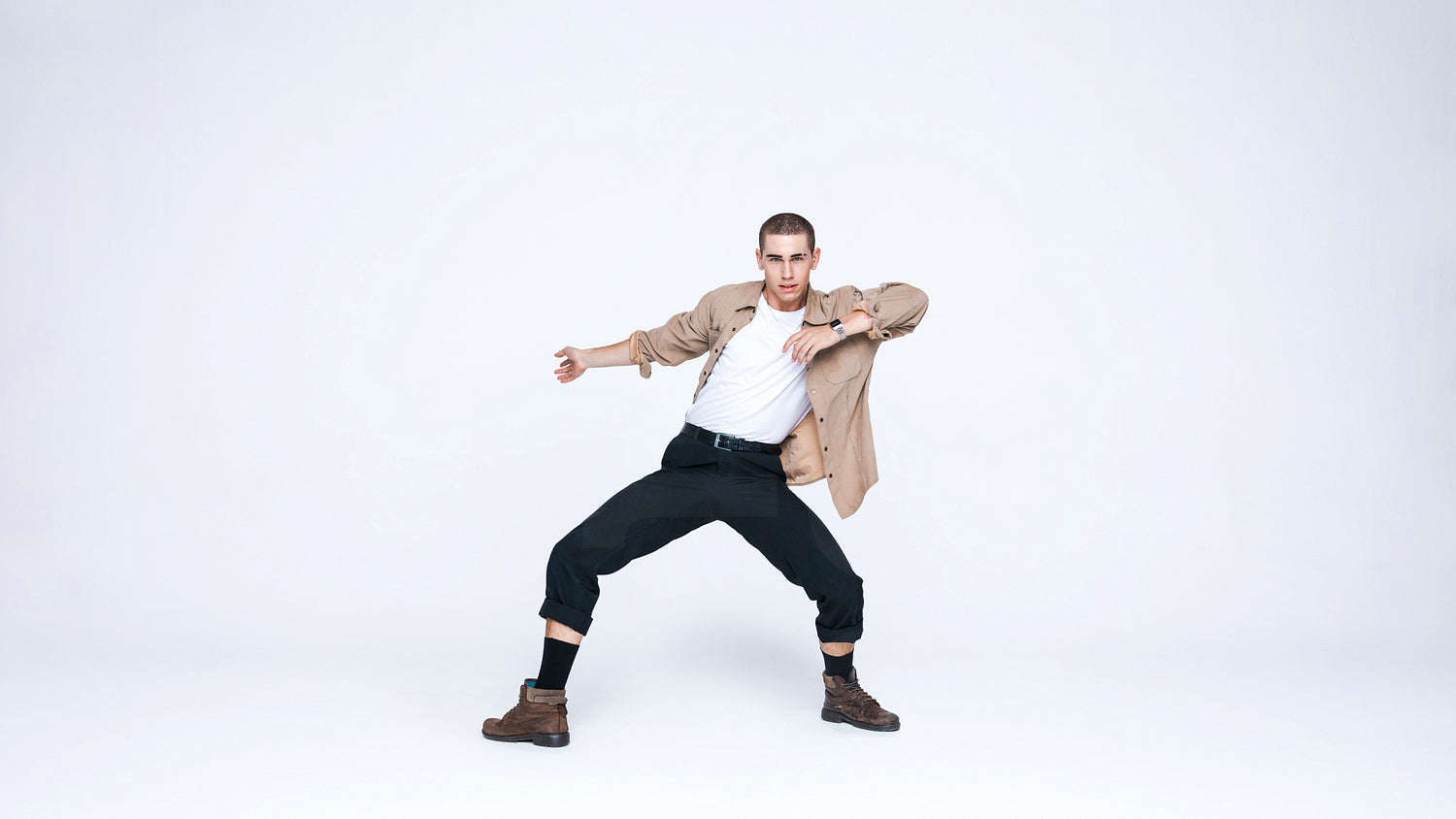 Young caucasian man in a dance pose. Man in casual clothes dancing against a white background.