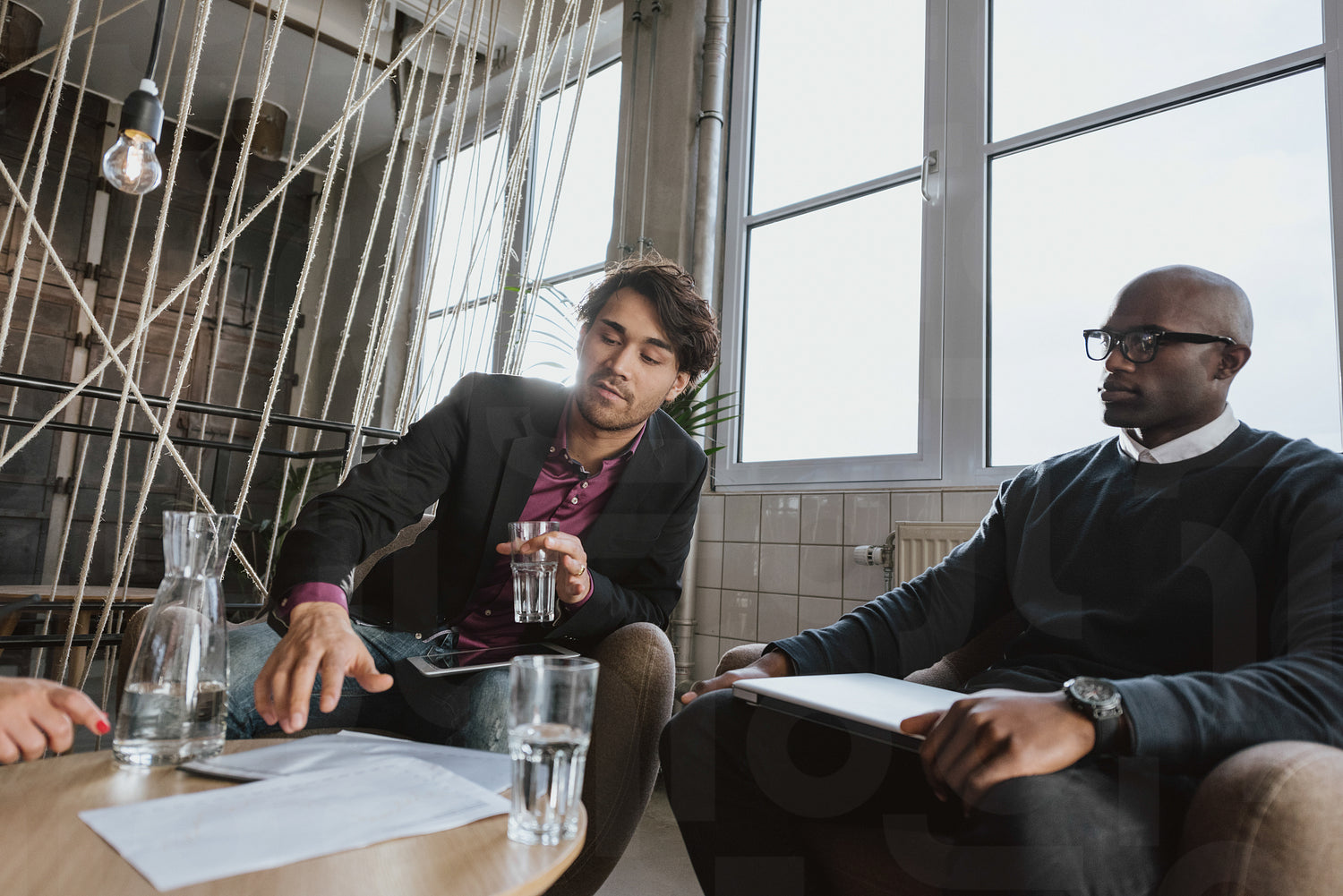 Young executive explaining something to his team in a meeting. Young man discussing business strategy with colleagues during a meeting.