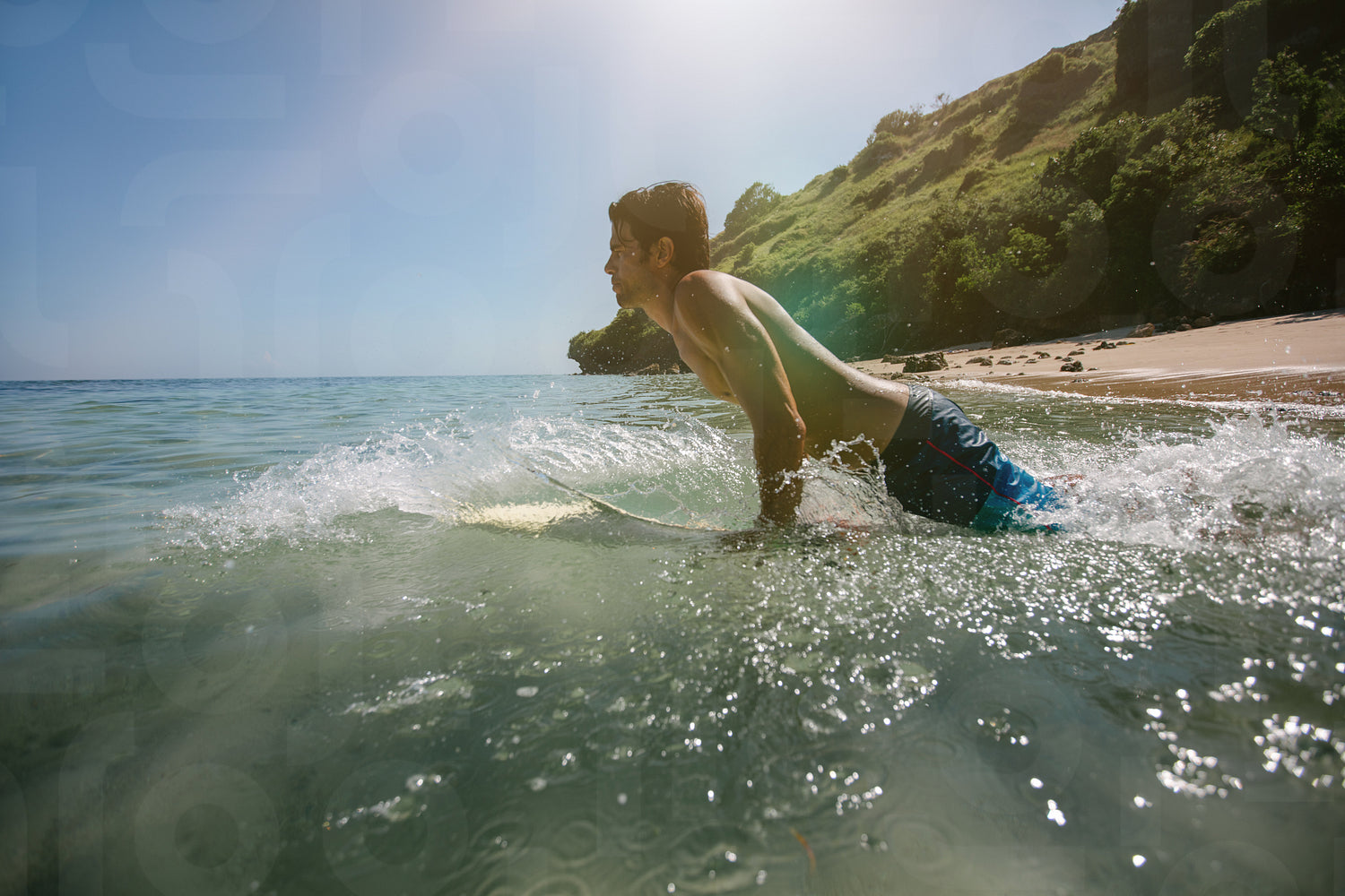 Side view shot of young man doing water surfing in sea. Male surfer in the ocean water with surf board.