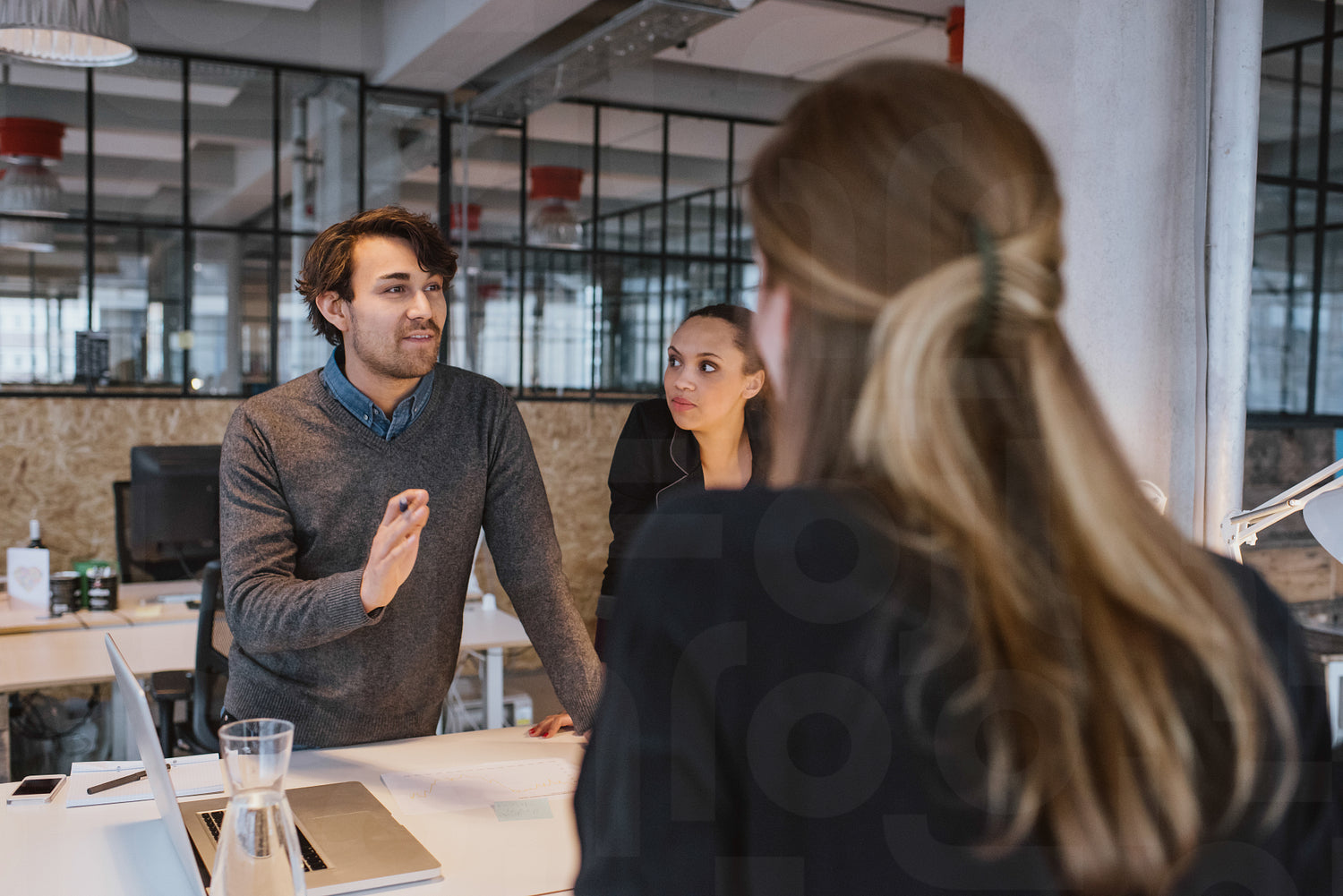 Young man explaining new business plan to coworkers during a meeting around a table in office.
