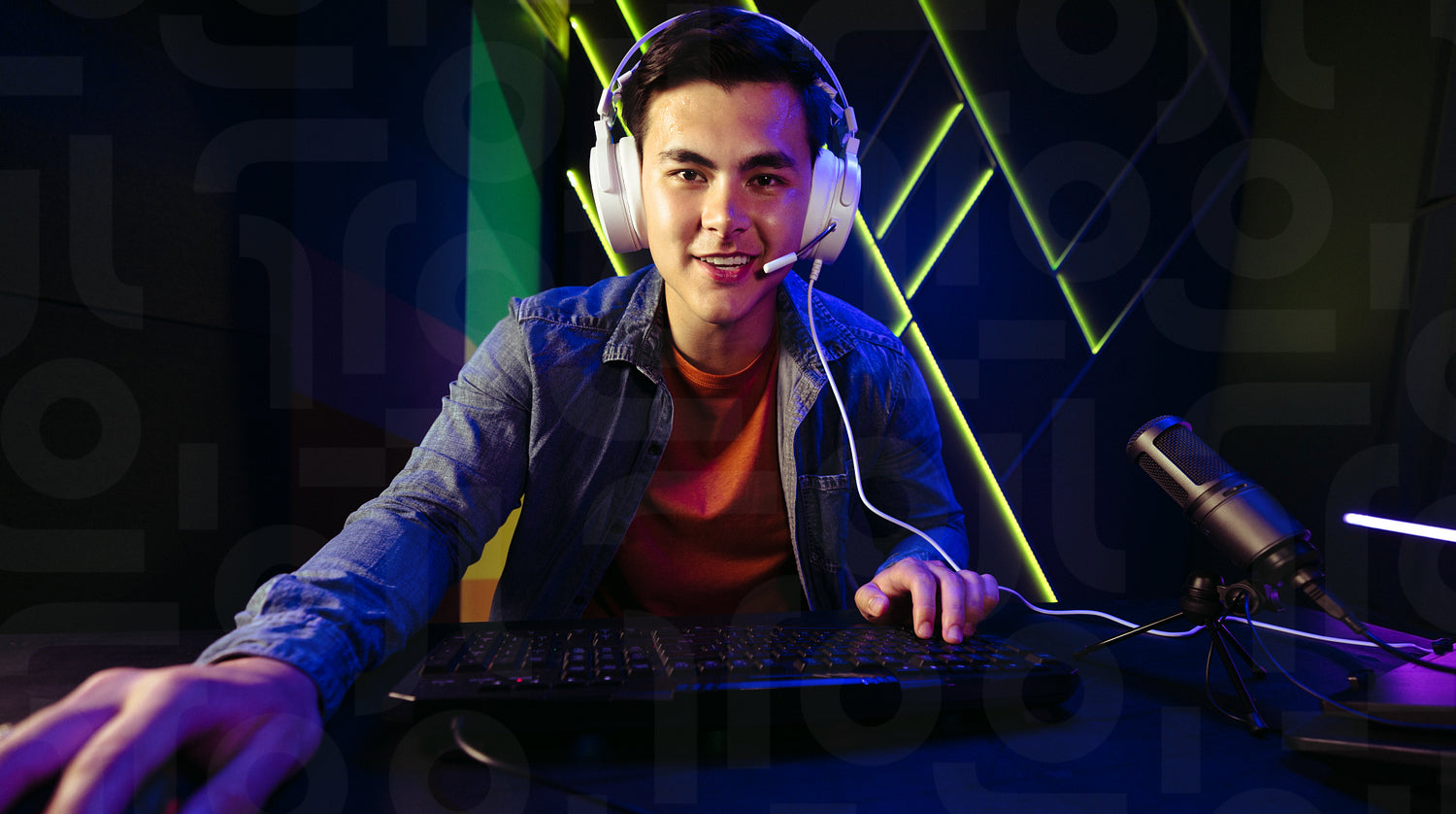 Happy young man sitting at a gaming computer with a headset, playing a fast-paced first-person shooter video game. With a microphone close by, he live streams and brings the gaming experience to viewers on an online streaming service.