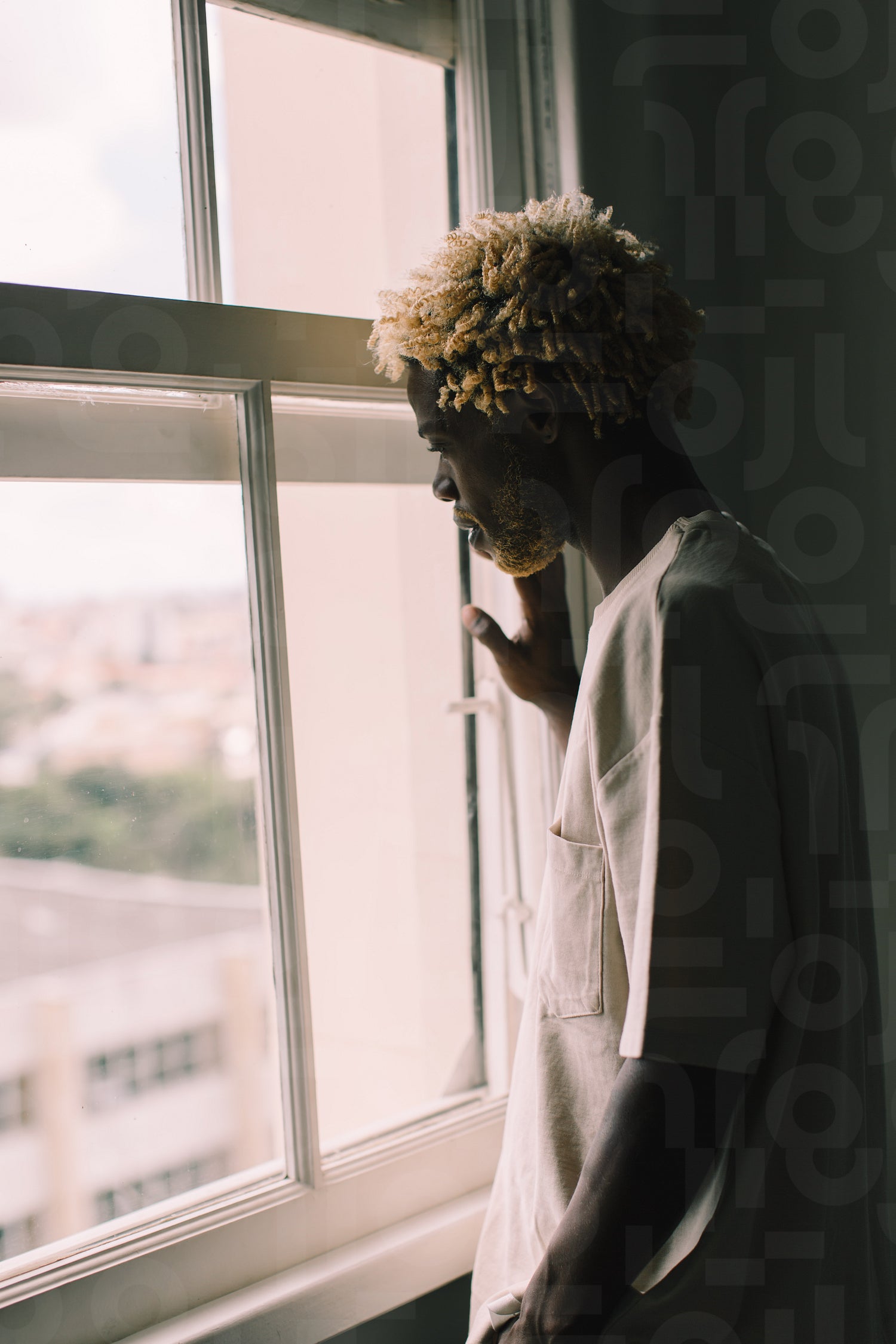 Young gay man looking outside his window during the day. Young queer man standing alone by a window indoors. Young man looking thoughtful at home.