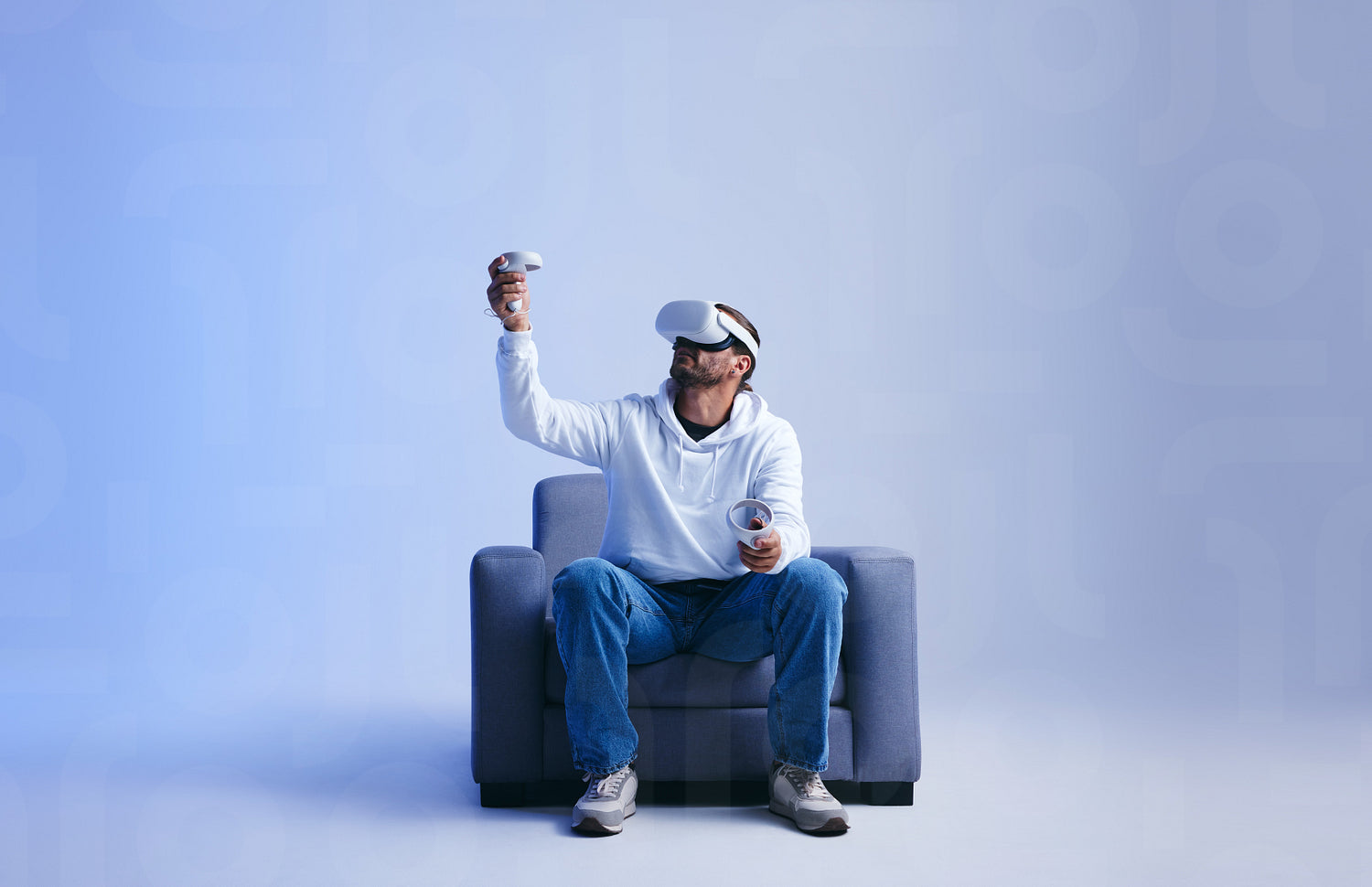 Young man playing an immersive virtual reality game on a couch. Man gaming with virtual reality goggles and controllers. Young man experiencing a 3D simulation.
