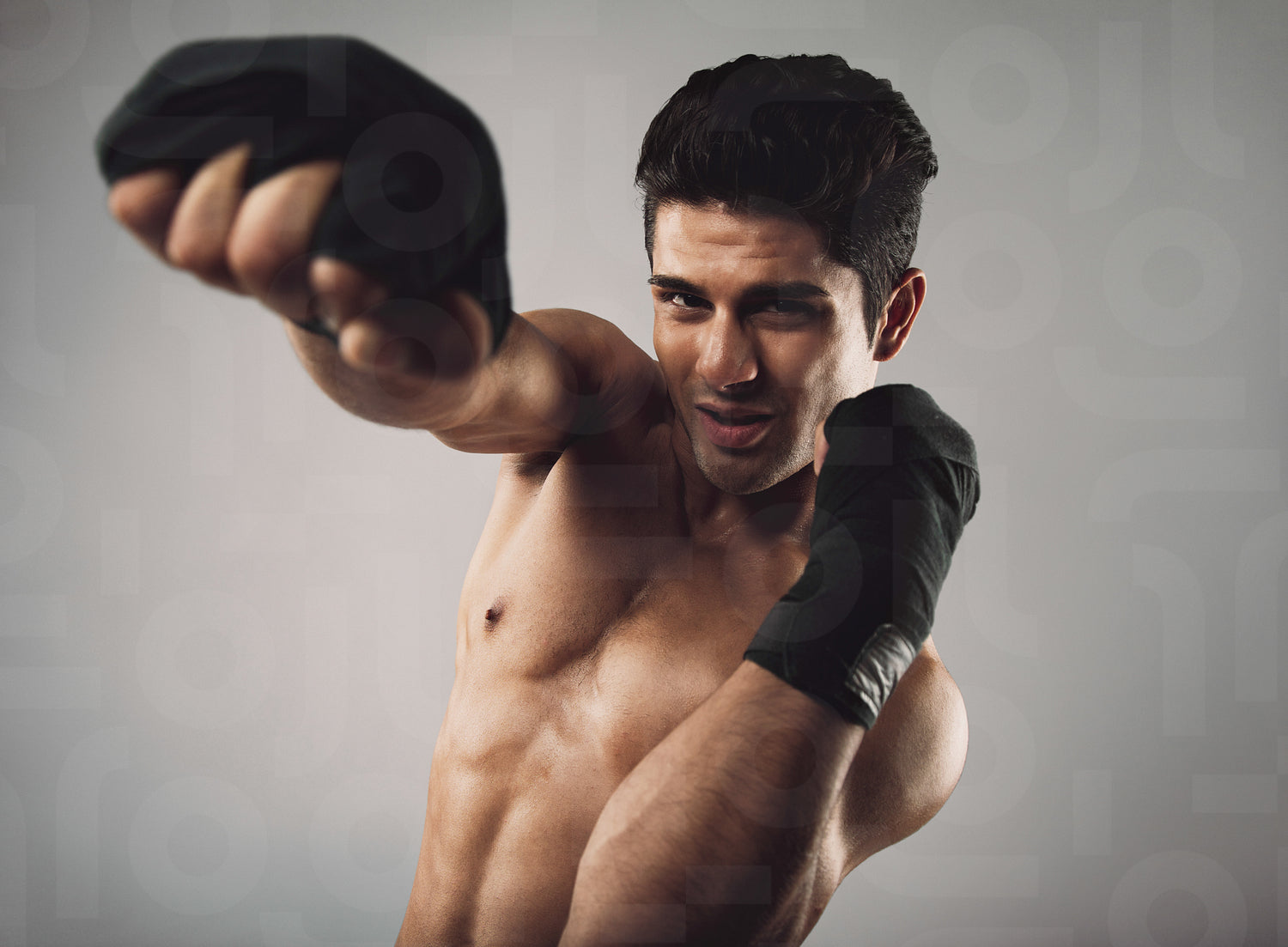 Hispanic young man practicing shadow boxing. Shirtless masculine male model with boxing gloves on grey background.