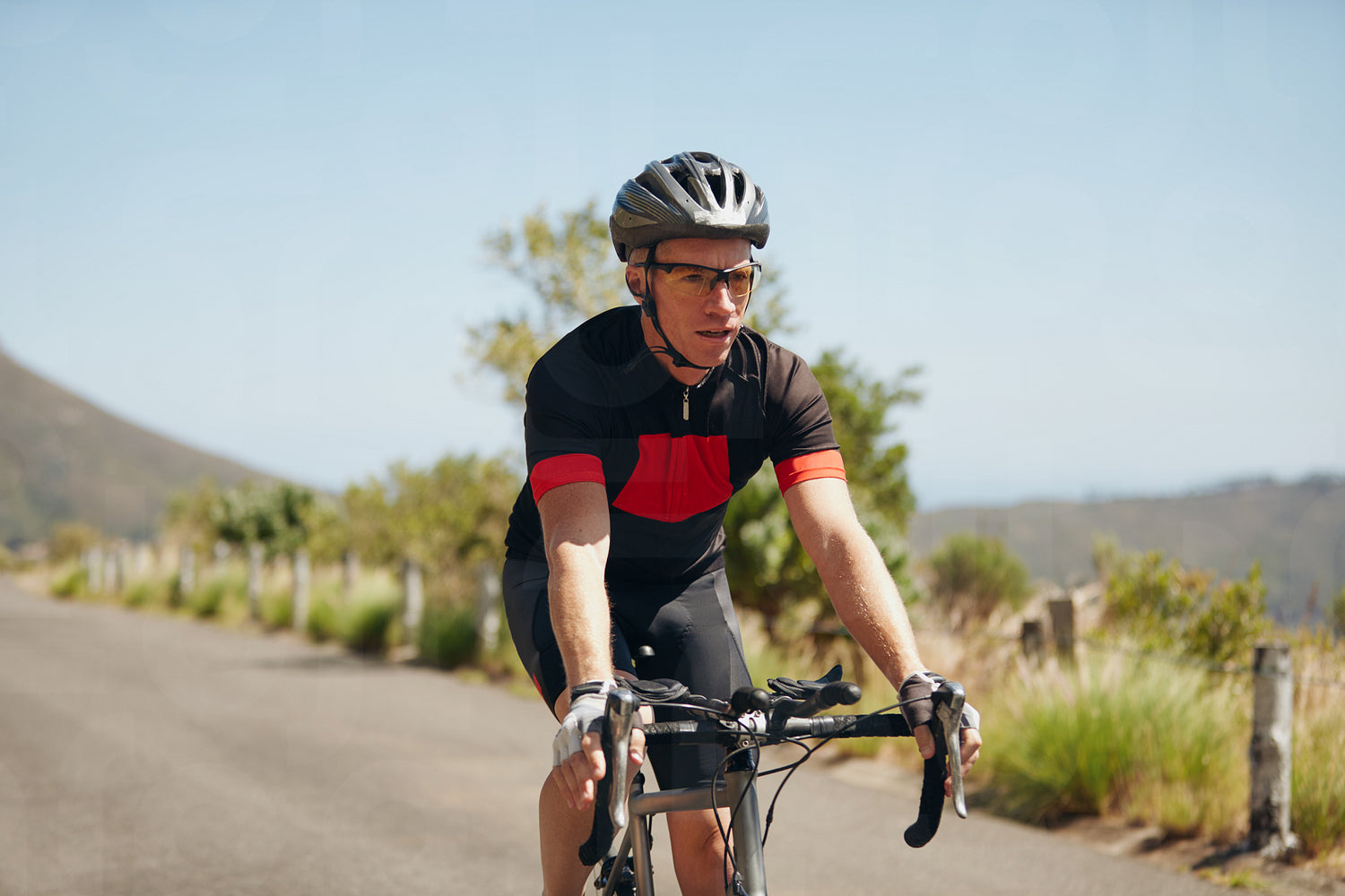 Man triathlon athlete cyclist riding down hill on country road. Young man riding bicycle on open road, practicing for triathlon competition.
