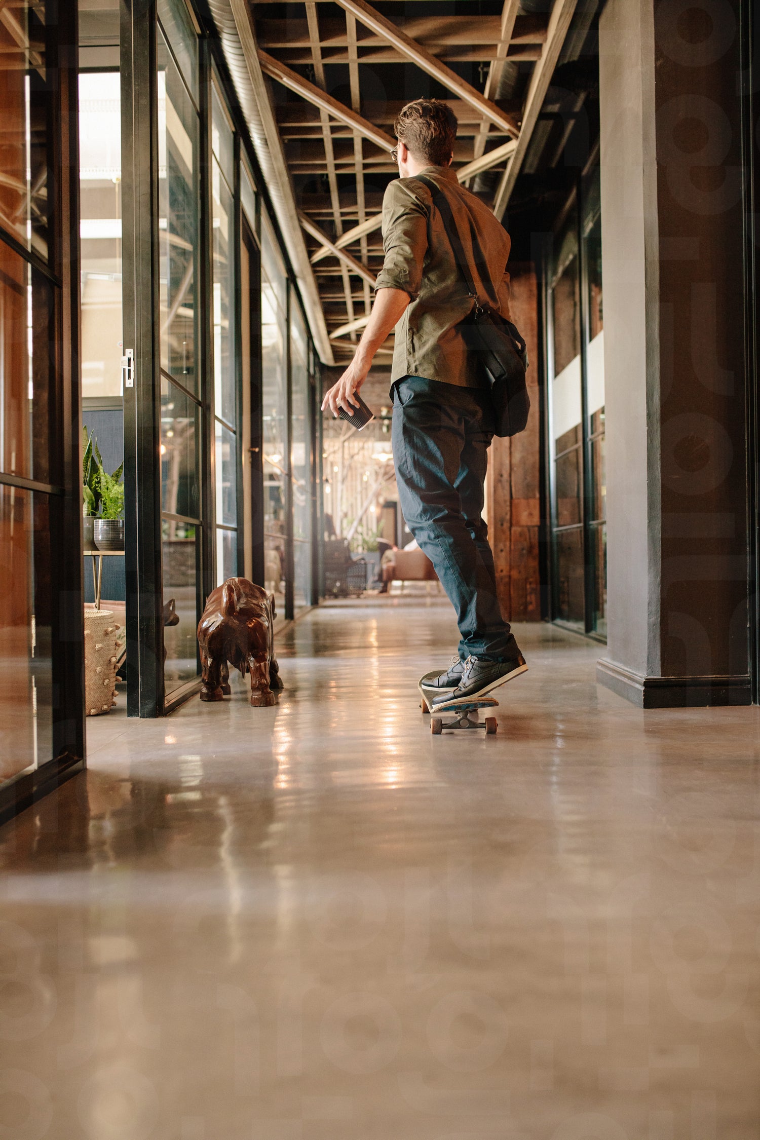 Full length rear view shot of young man skateboarding in modern office. Casual businessman skating through his startup office.