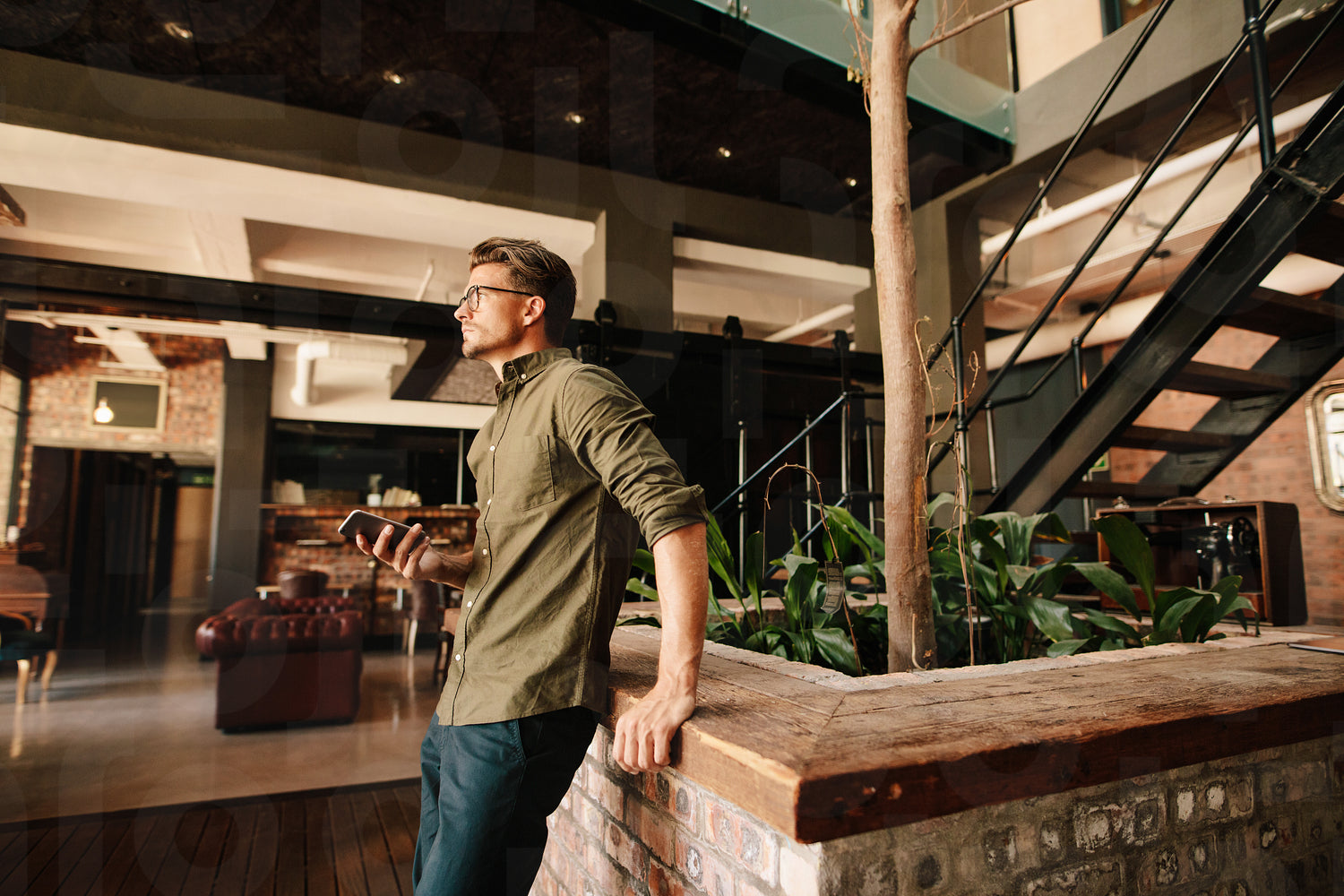 Side view of young man standing in modern office looking away and thinking. Male executive relaxing in break.