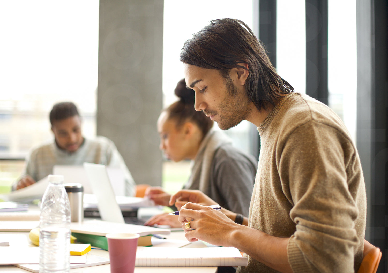 Young man talking notes for study with students studying in background. University students preparing for final exams in library.