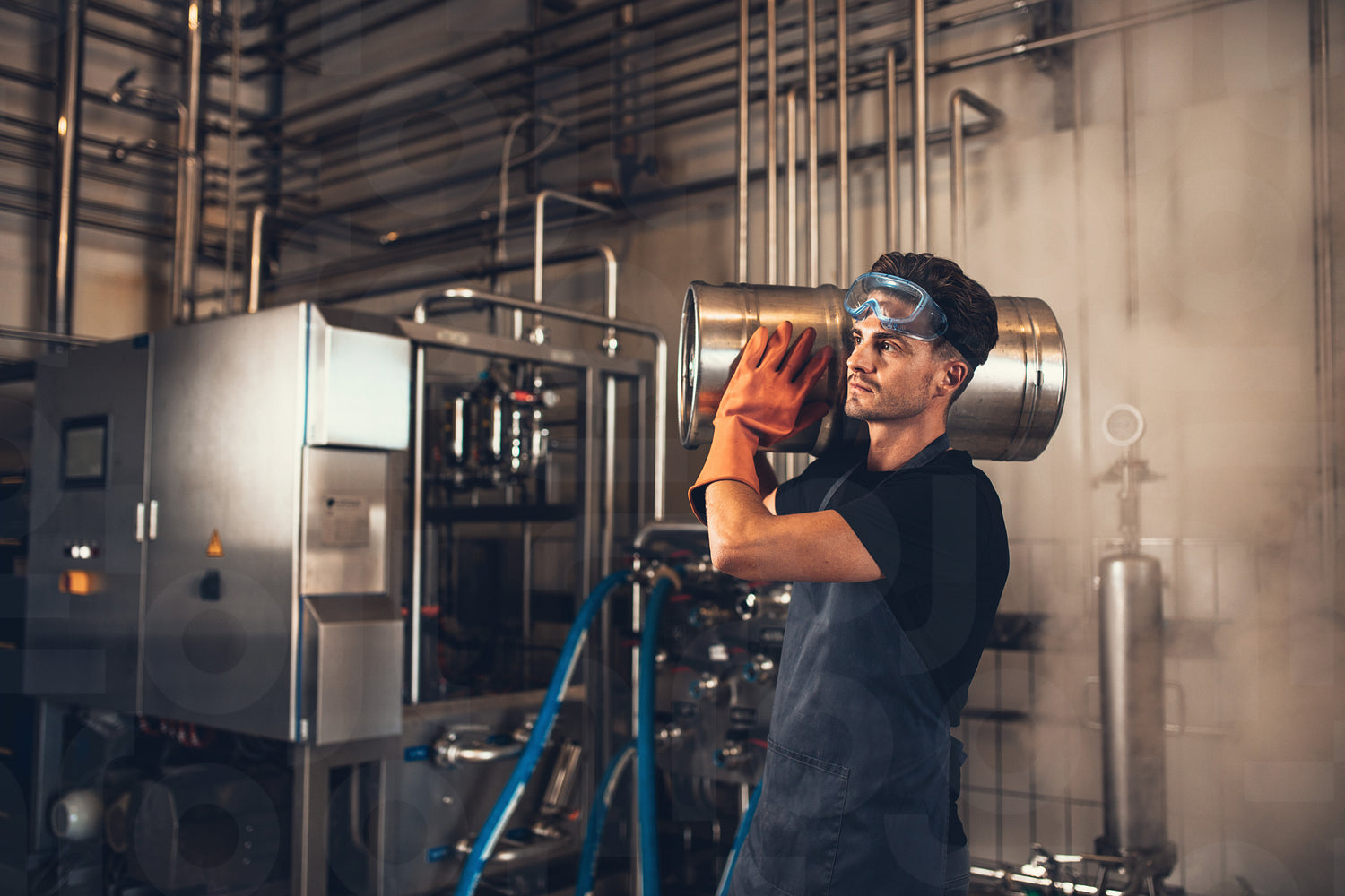 Shot of young man with metal beer barrels at brewery. Brewer carrying keg at brewery plant.