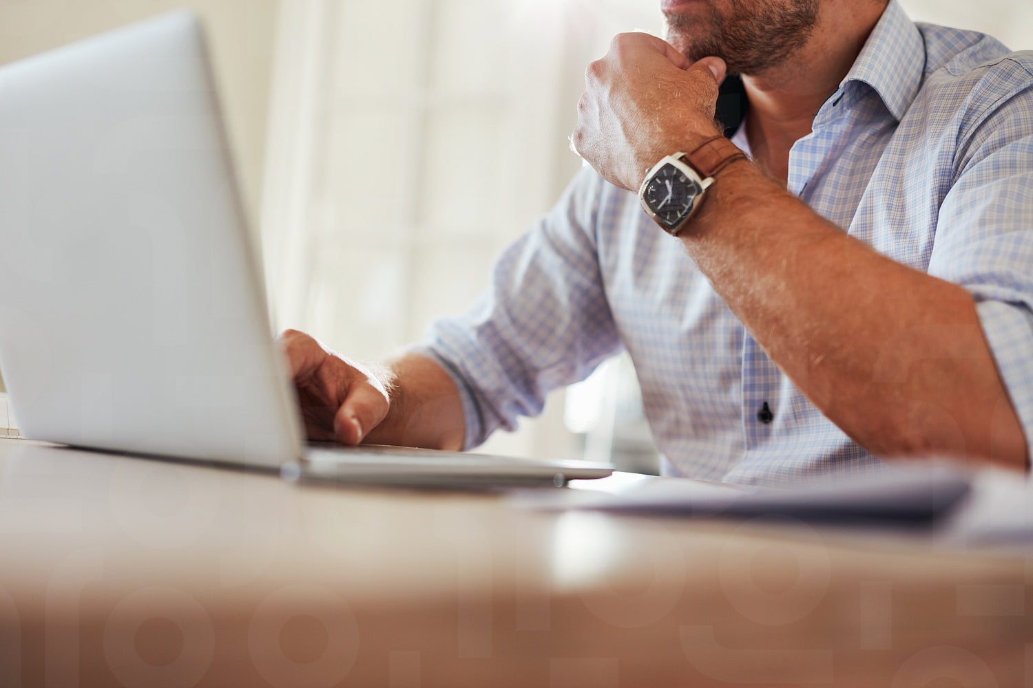 Close up shot of young man sitting at table and working on laptop. Businessman working from home.