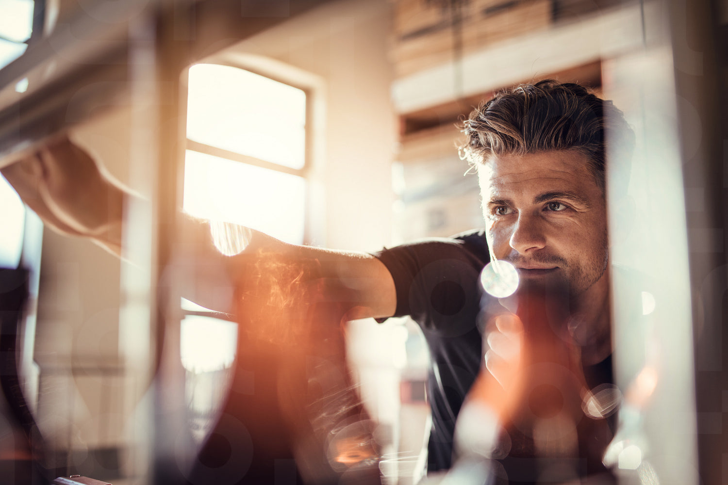 Shot of young man working on the beer bottling machine at brewery factory. Male brewer checking the process of beer manufacturing in factory.
