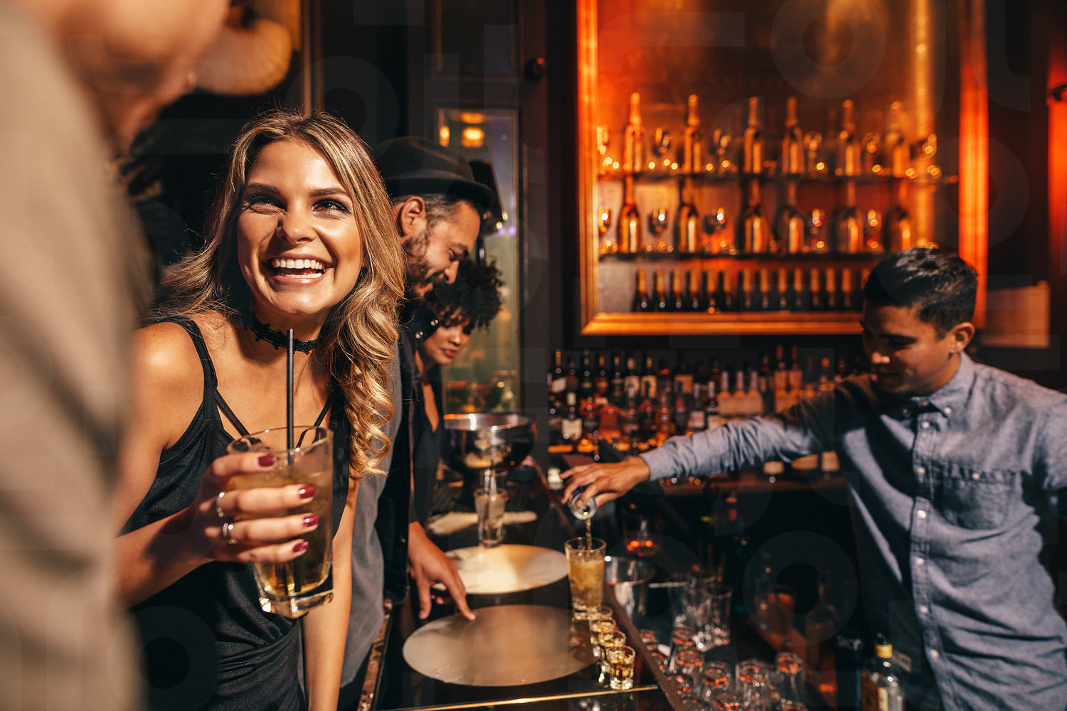 Beautiful young woman with her friends at bar. Young people enjoying a night at club.