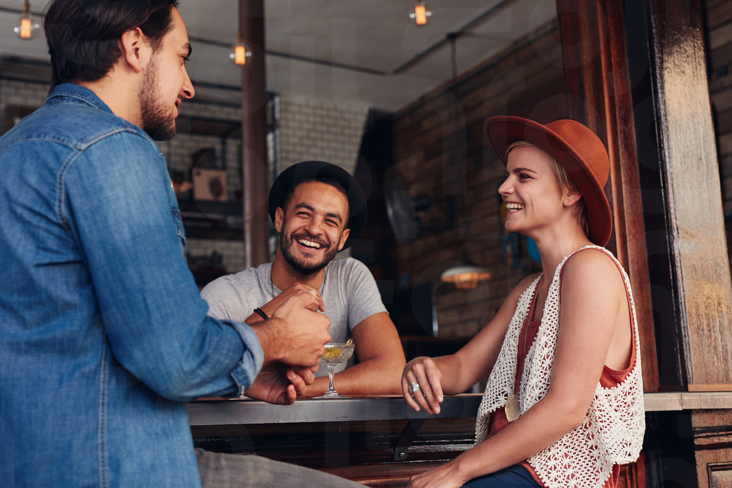 Young men and women sitting together and talking in a coffee shop. Group of young friends hanging out at a cafe.