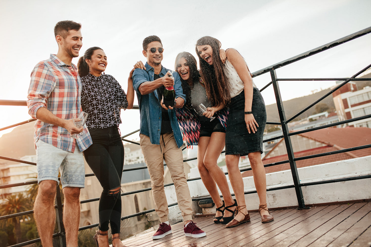 Outdoor shot of young man opening a bottle of champagne with friends. Young people having champagne at party.