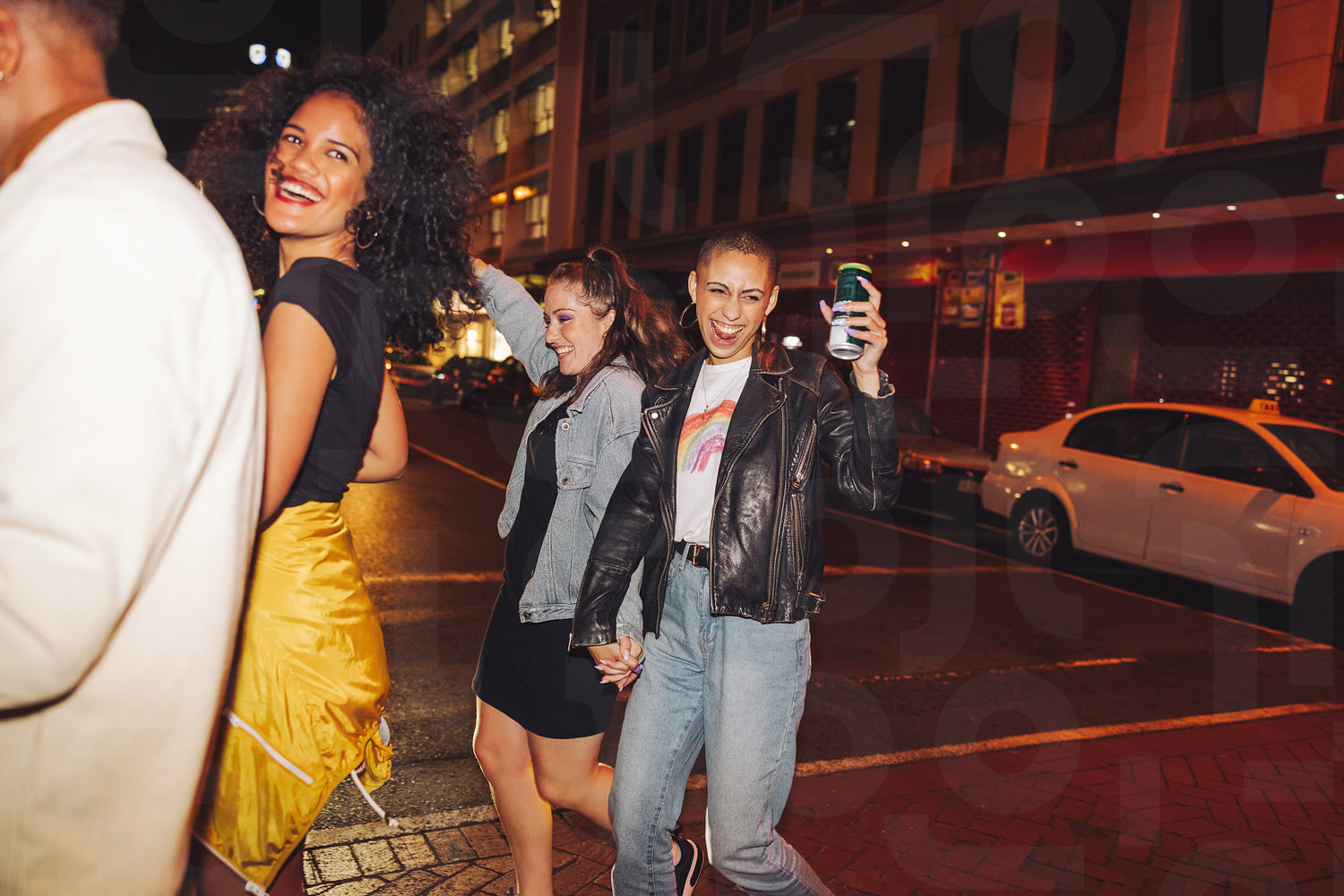 Young people having fun in the city at night. Two female friends dancing happily while walking with their friends across a street. Group of young friends having a good time on the weekend.