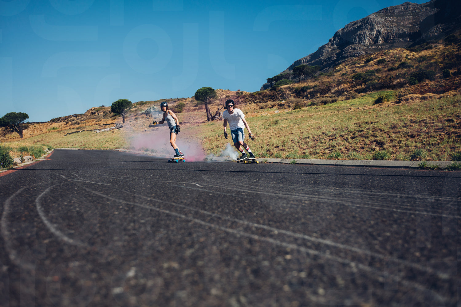 Young man and woman skateboarding with smoke bomb on the road. Young couple practicing skating on a open road.