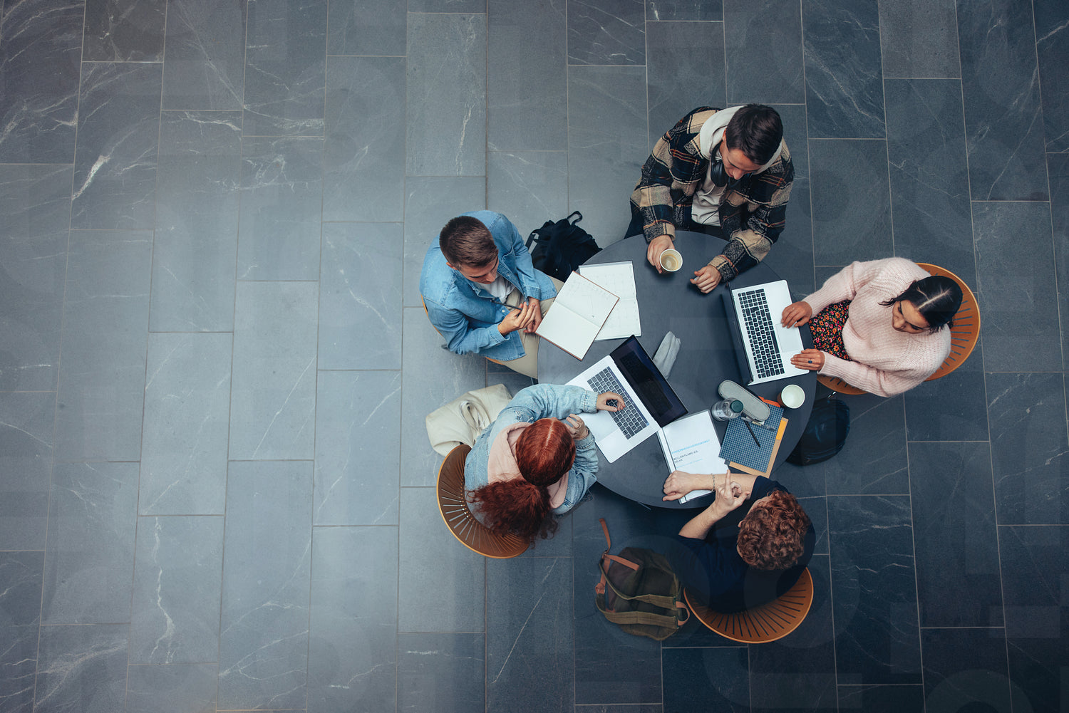 Top view of university students sitting in a library with books and laptop. Young people studying together at college library.