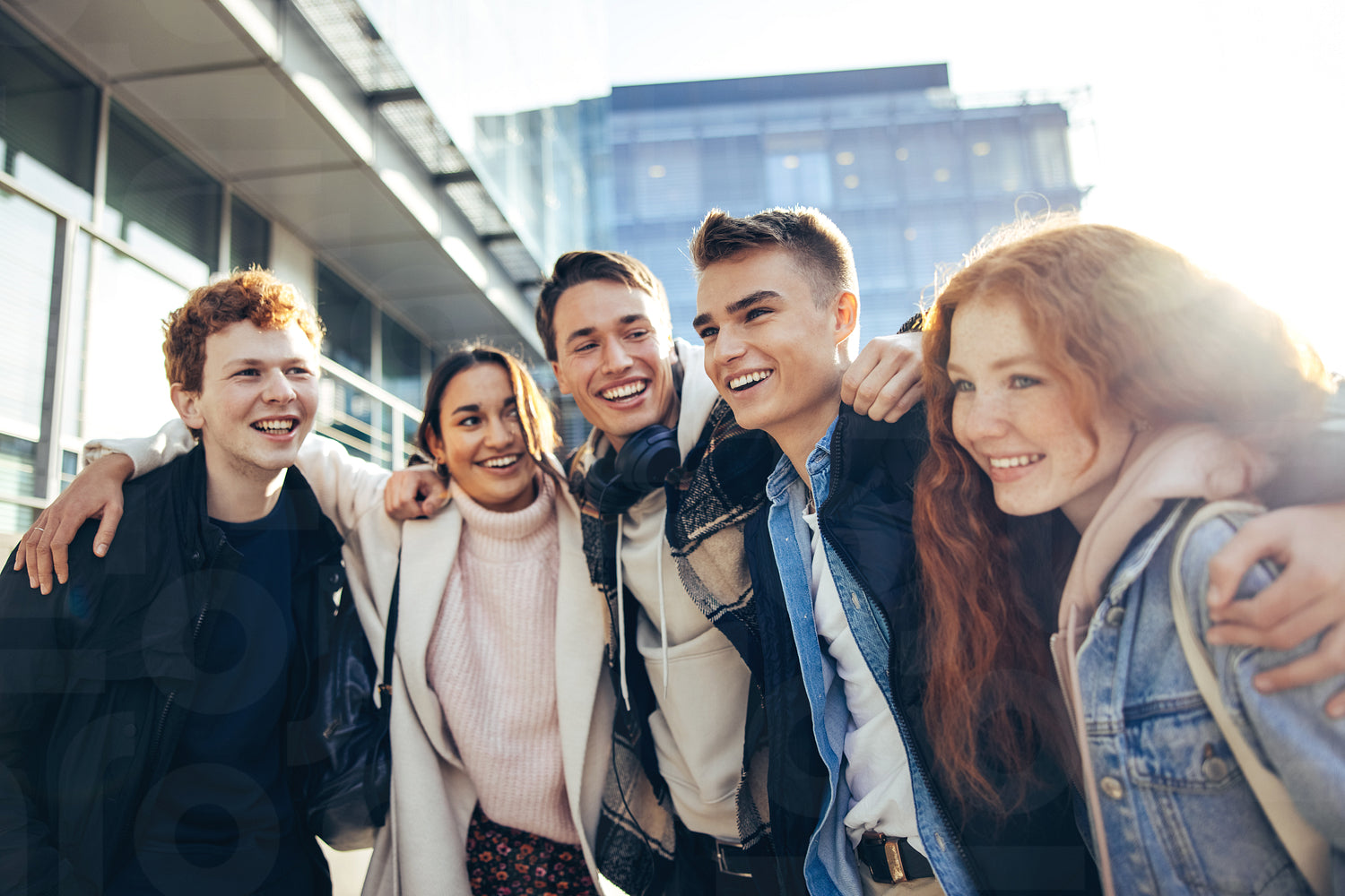 Young people standing together in university. Students together having leisure time at college outdoors.