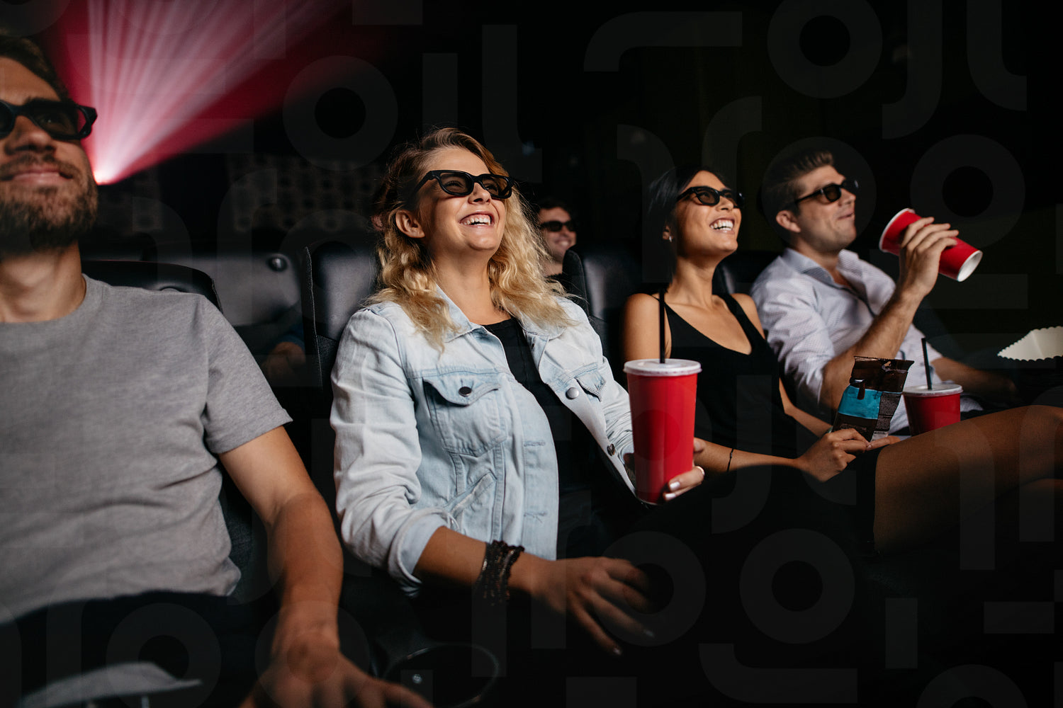 Young women and men watching 3d movie in cinema. Group of people in theater with 3d glasses and drinks.