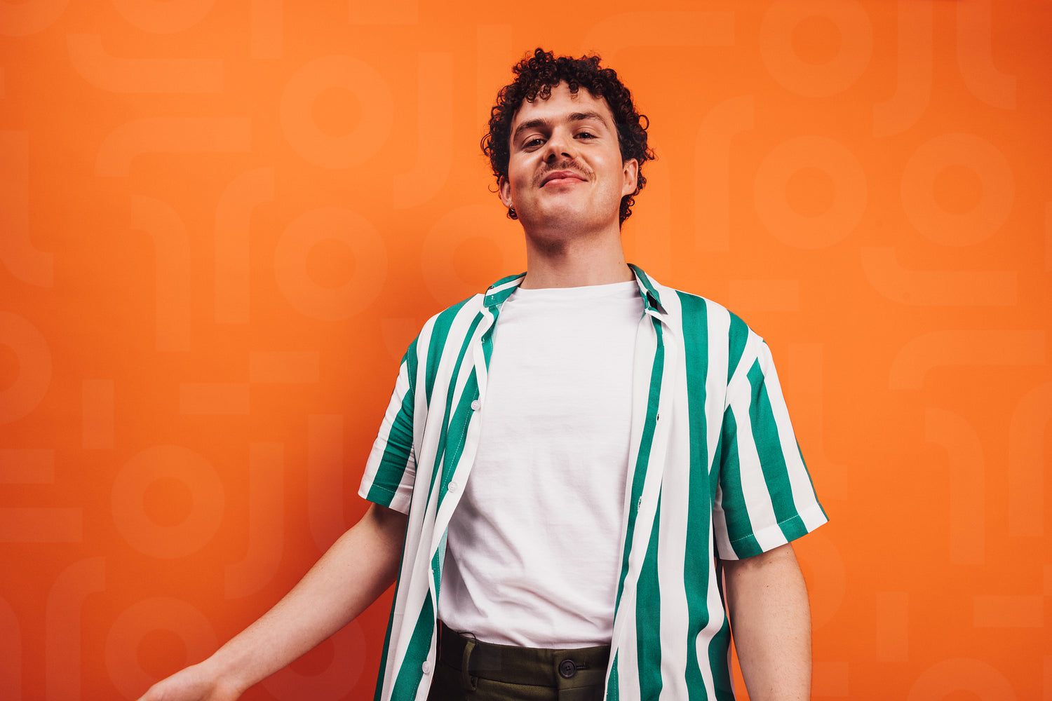 Young queer man looking at the camera with a cheerful face in a studio. Happy young generation z hipster smiling while standing alone against an orange background.