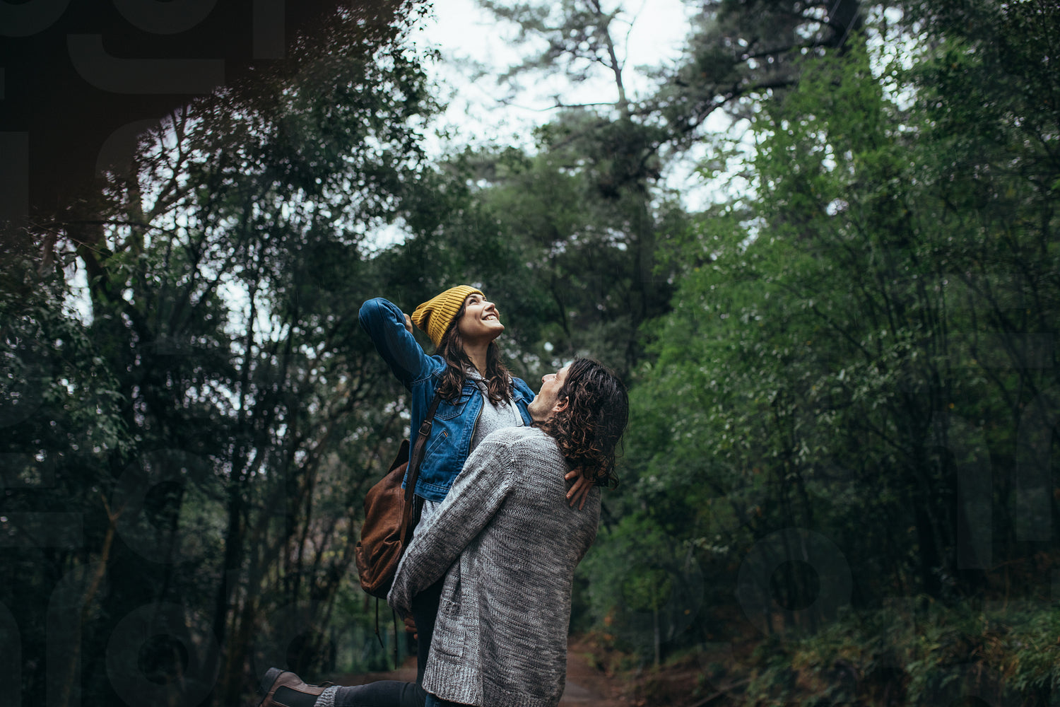 Smiling couple enjoying rain in the forest. Young man holding his girlfriend and having fun in the rain.