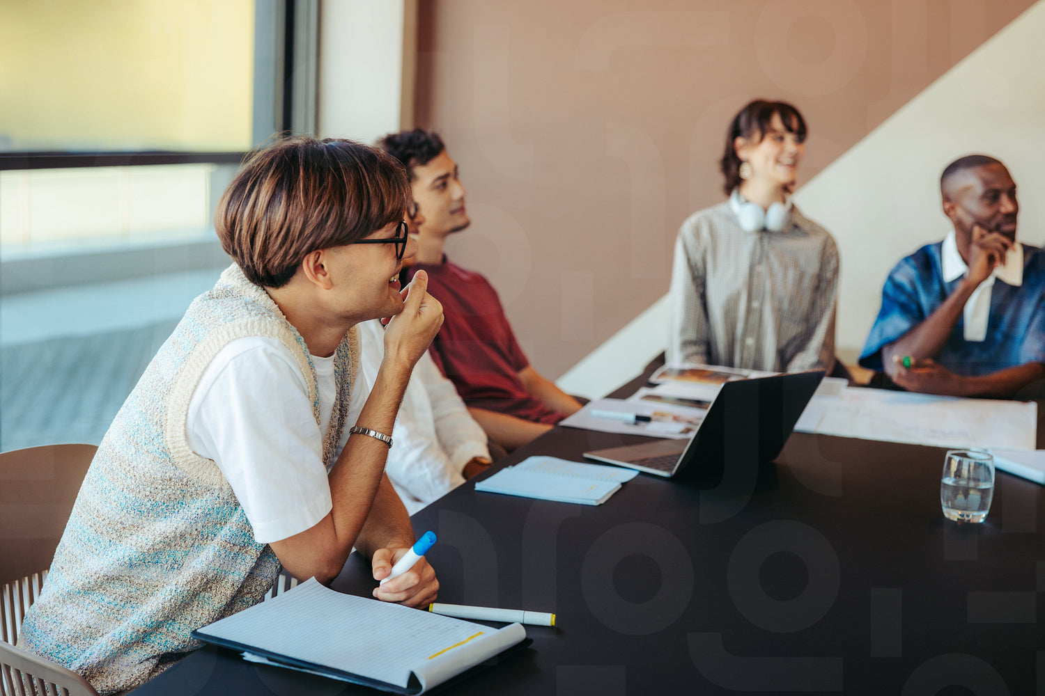 Young students engaged in a contemporary classroom setting, participating in a collaborative discussion with laughter and focus