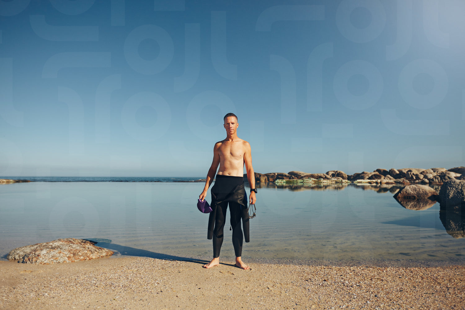 Young triathlete preparing for a race wearing a wetsuit prior to the swim start. Young man on lake getting ready for triathlon one summer day.