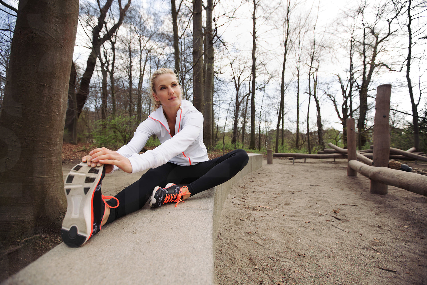 Woman doing stretching exercise in park. Caucasian female model exercising in nature.