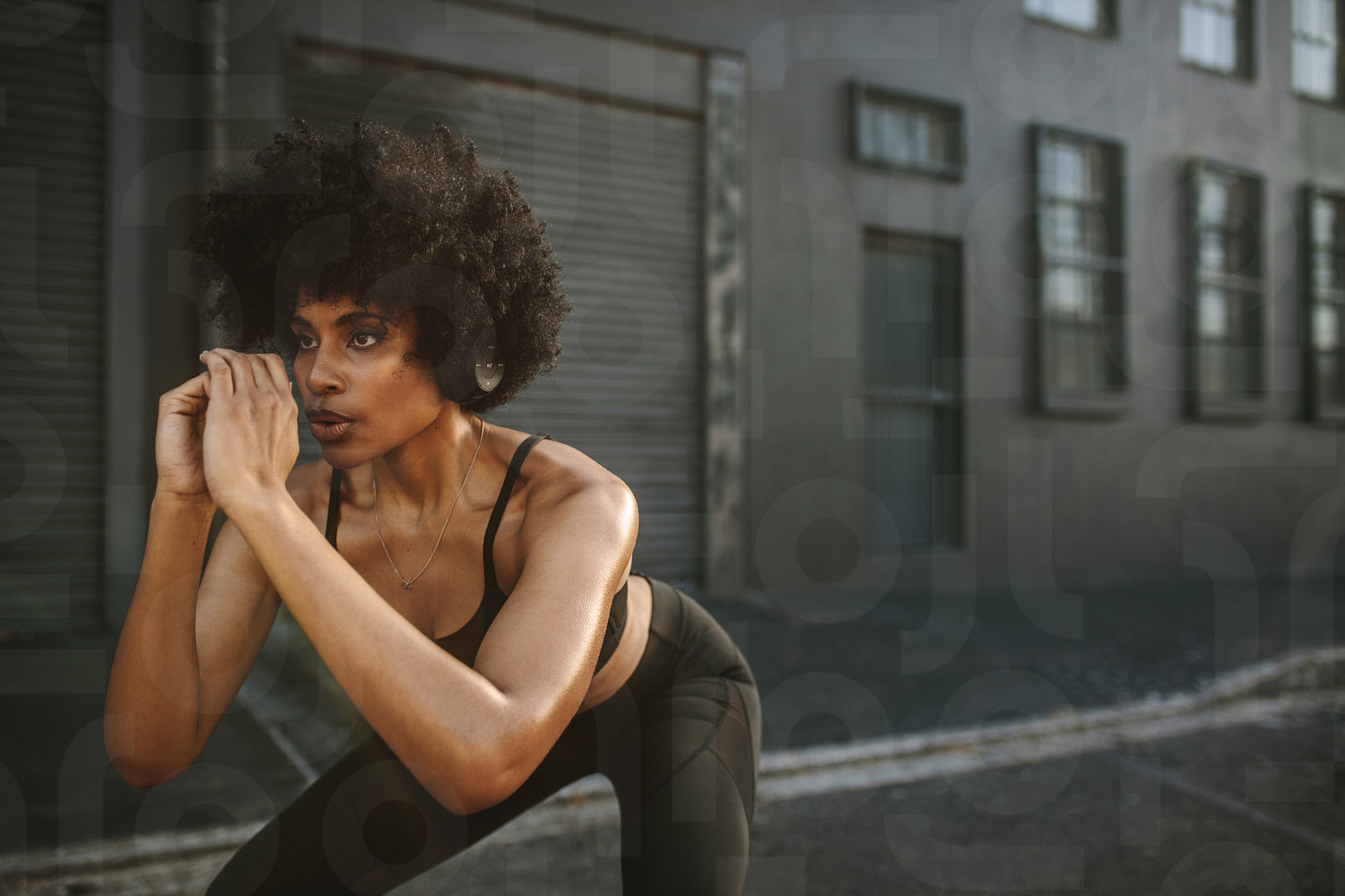 Young woman practicing squats in city. Female athlete exercising outdoors in morning.