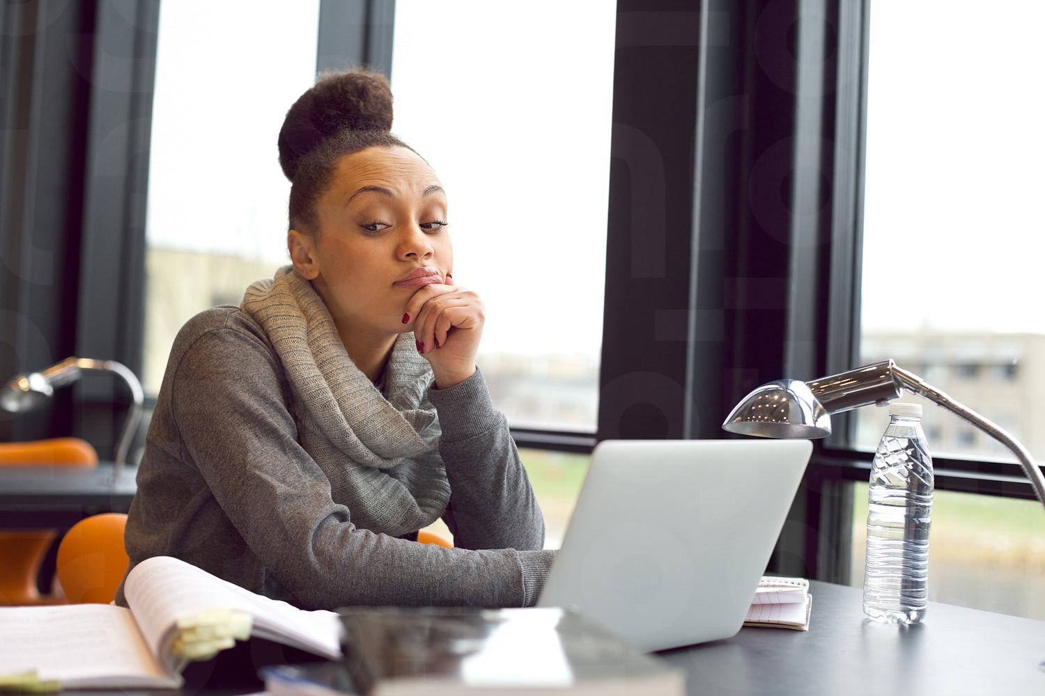 Young female student studying in library looks bored or tired. Young woman sitting at desk with laptop computer and books for study.