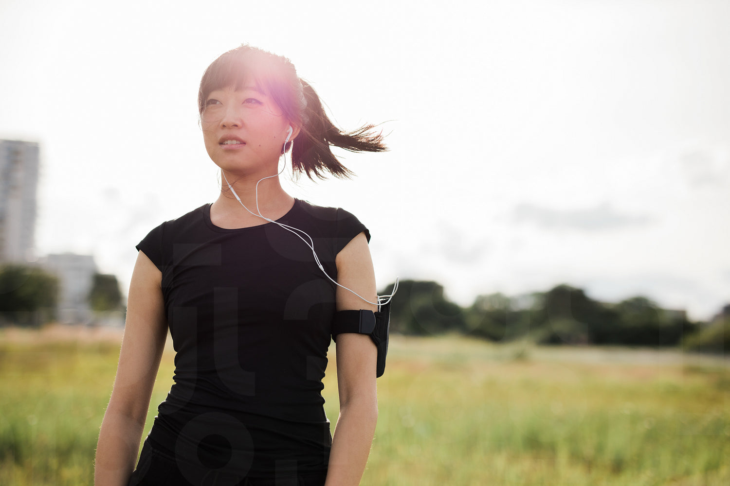 Shot of young woman in sportswear standing outdoors in city park on sunny day and looking away. Chinese female runner ready for morning workout.
