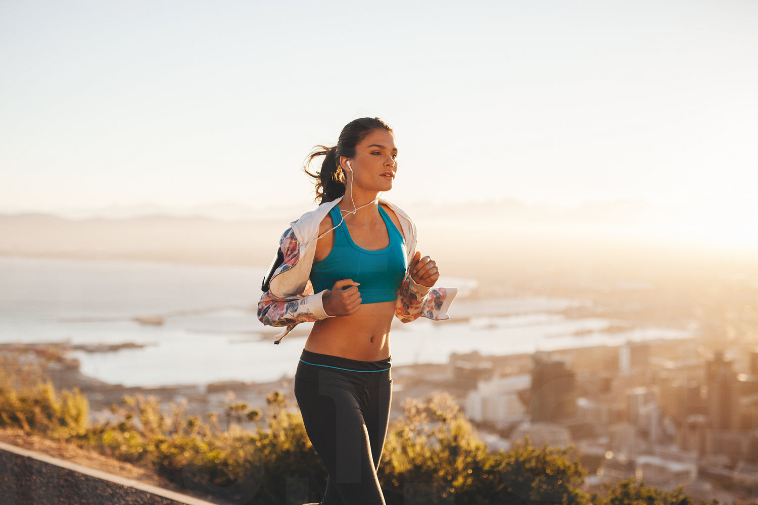 Fit young woman jogging outdoors. Female athlete on morning run with bright light.