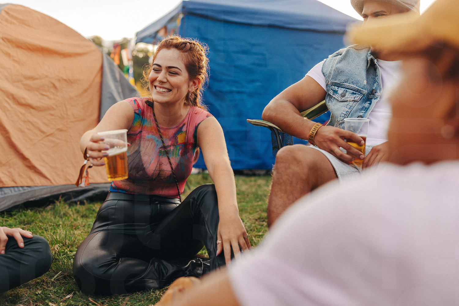 Joyful young woman raises her beer glass in a festive toast during a lively celebration at the summer festival. Young woman sitting at a campsite, surrounded by friends and festival goers. This photo has intentional use of 35mm film grain.