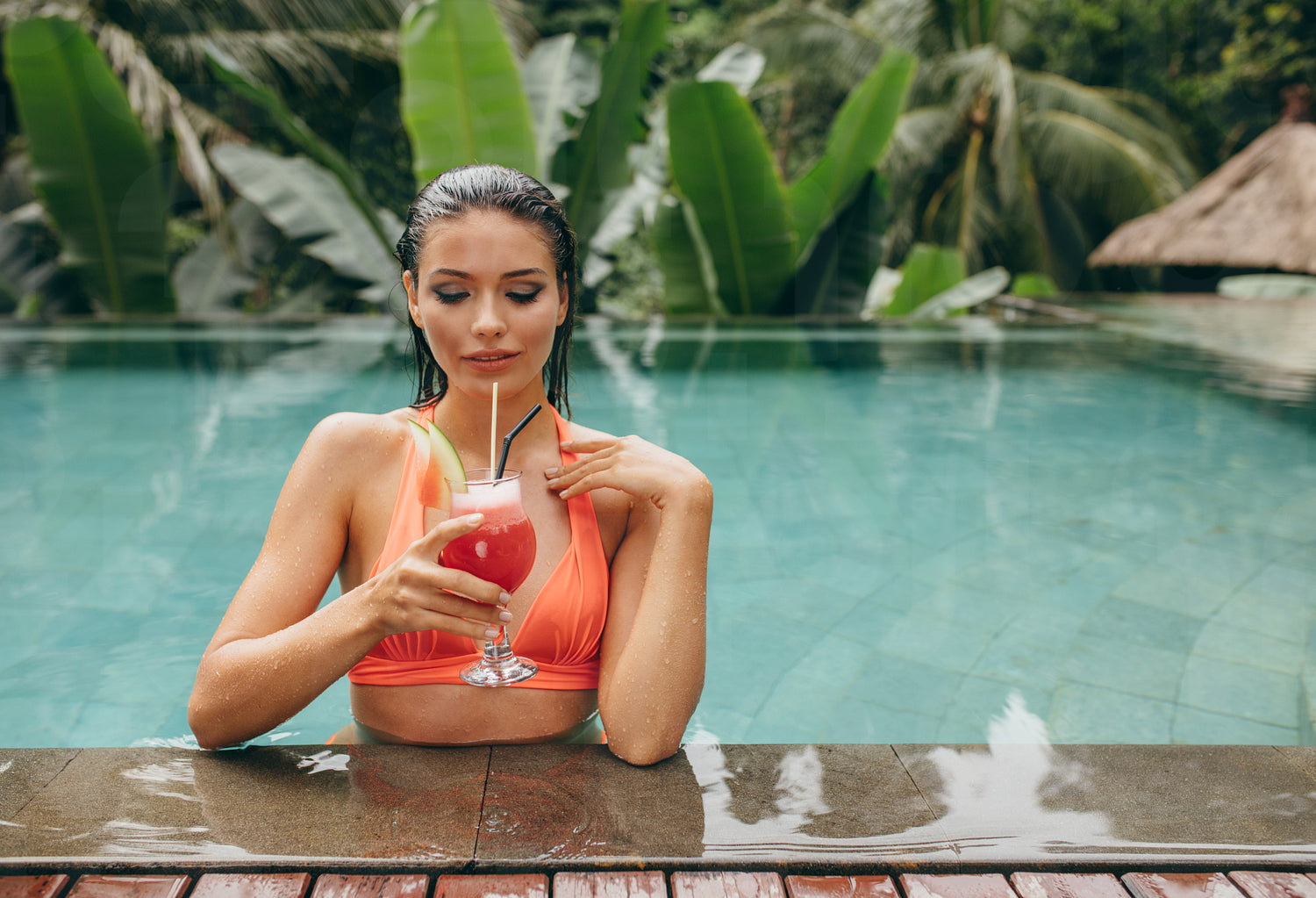 Portrait of young woman relaxing in swimming pool and having a cocktail. Caucasian female model in bikini at luxury holiday resort.