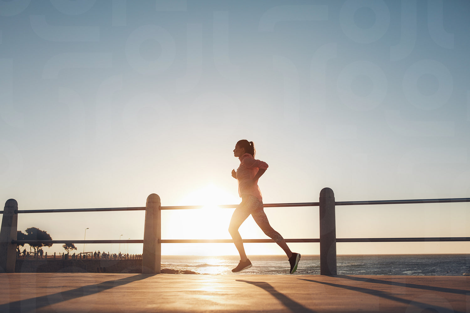 Silhouette of young woman running along the sea during sunset. Fitness woman jogging on a road by the sea.