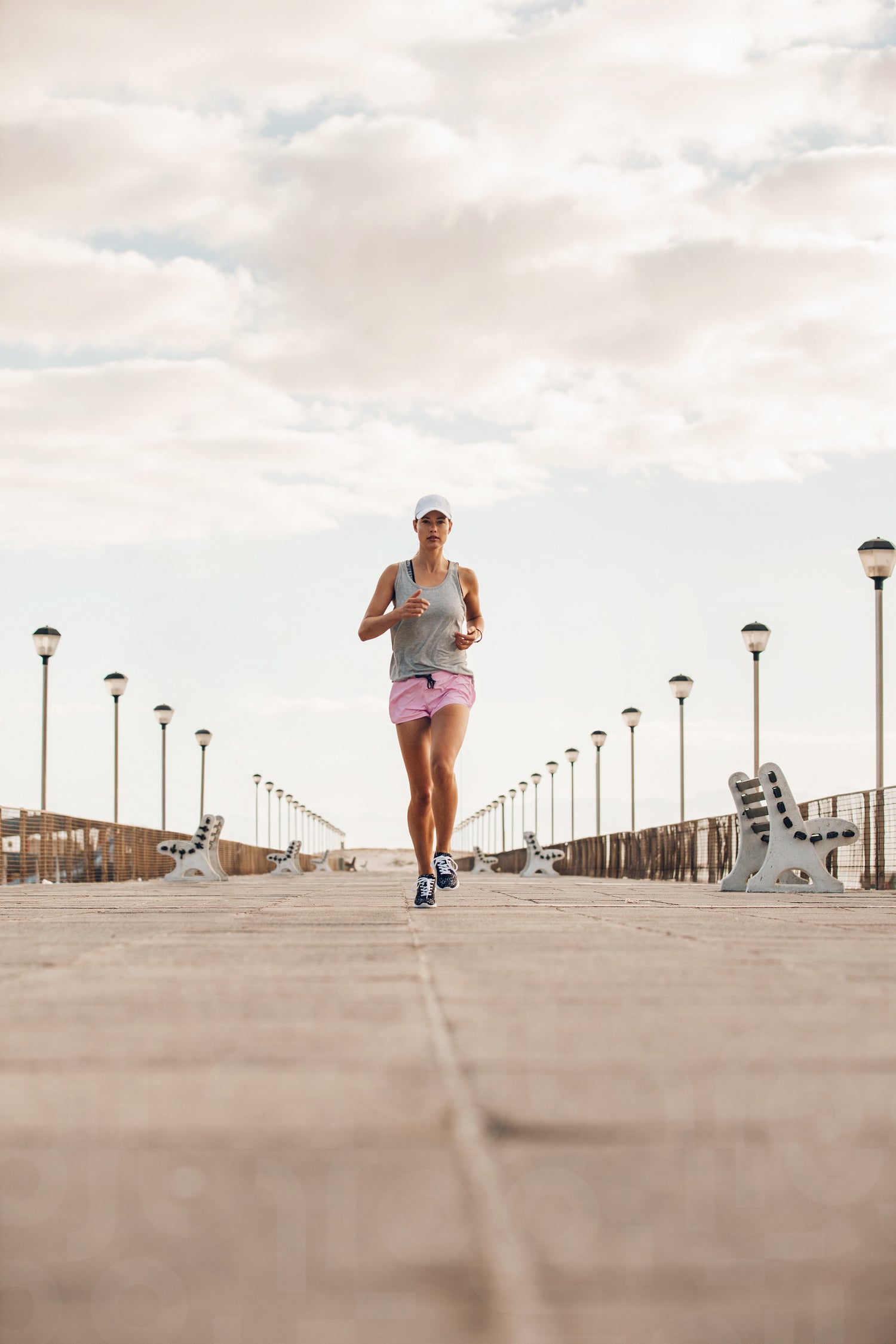 Full length shot of young woman running on the sea side promenade. Female runner working out in the morning.