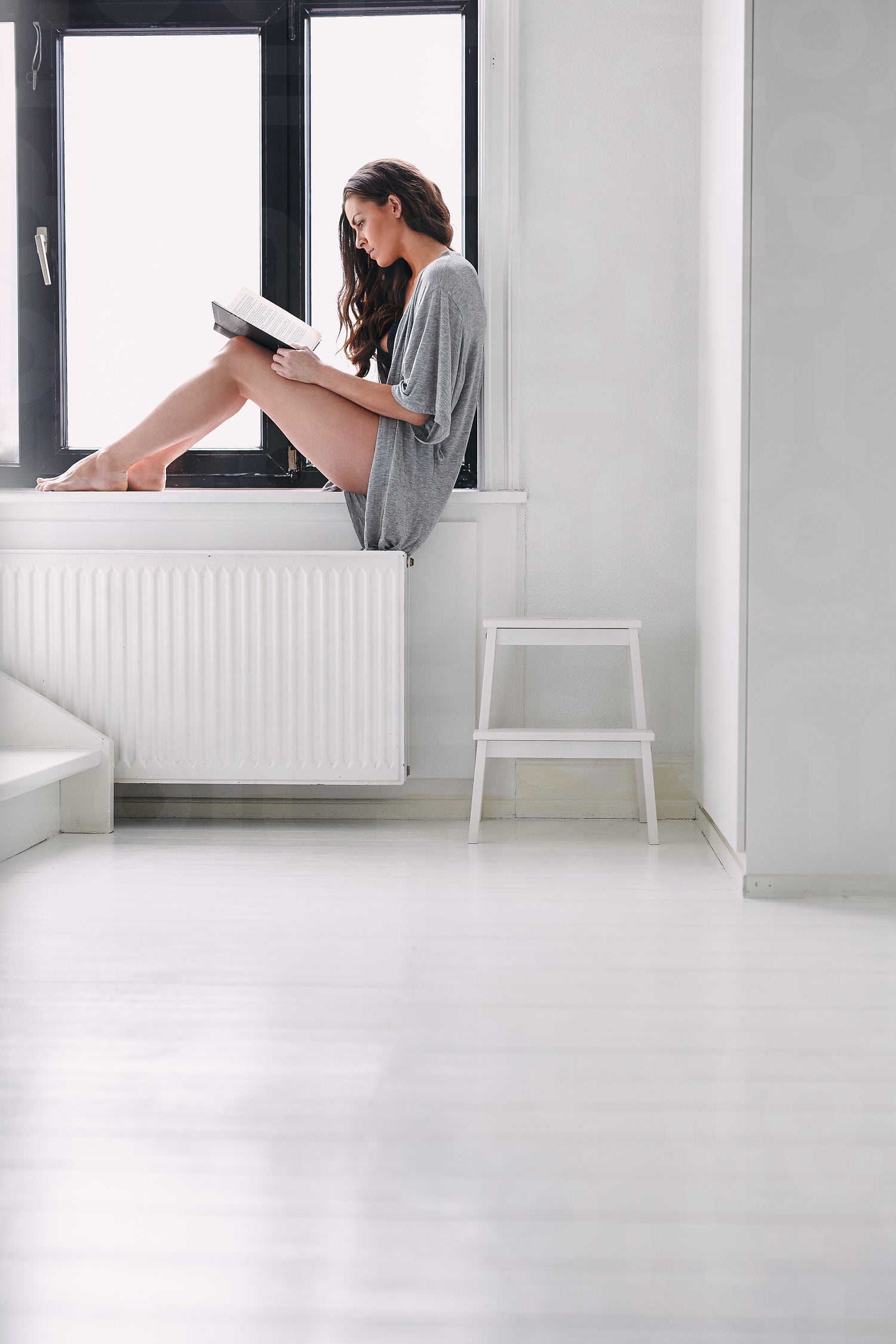 Indoor shot of young woman sitting on window sill and reading a book. Caucasian female model in nightwear busy reading a novel by window at home.