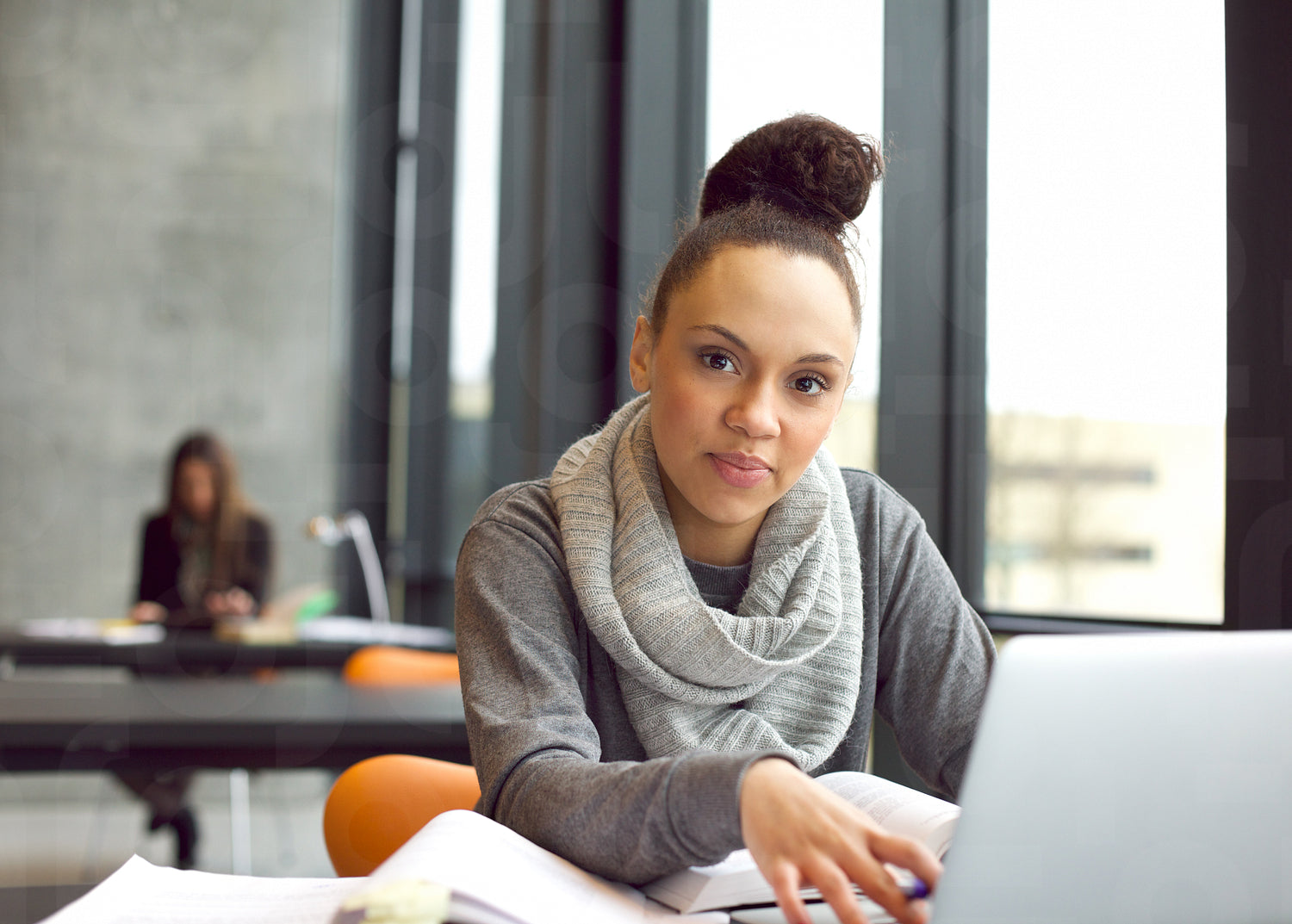 Pretty young student sitting in the library with books and a laptop computer to search information for her studies. Young woman preparing university project.