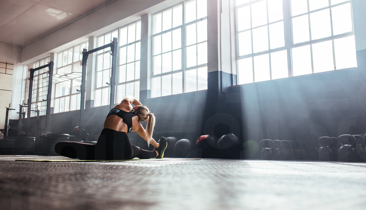 Young woman working out in gym. Back view of woman doing stretching exercise in the morning sunlight at the gym.