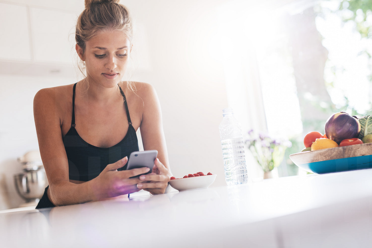 Young woman using mobile phone in kitchen while eating breakfast. Beautiful female reading text message on her smart phone.
