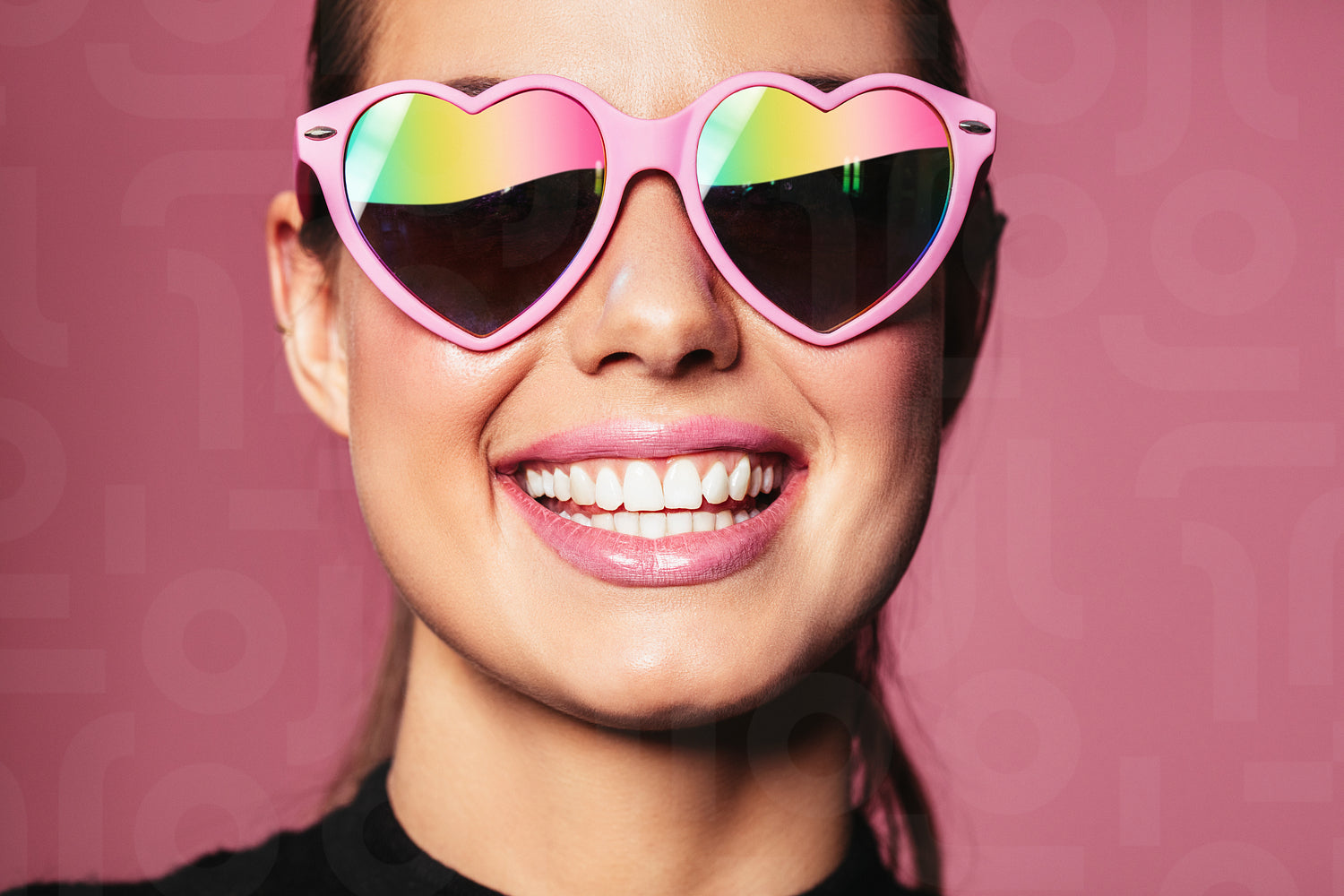 Closeup portrait of beautiful young woman wearing heart shaped sunglasses and smiling against pink background.